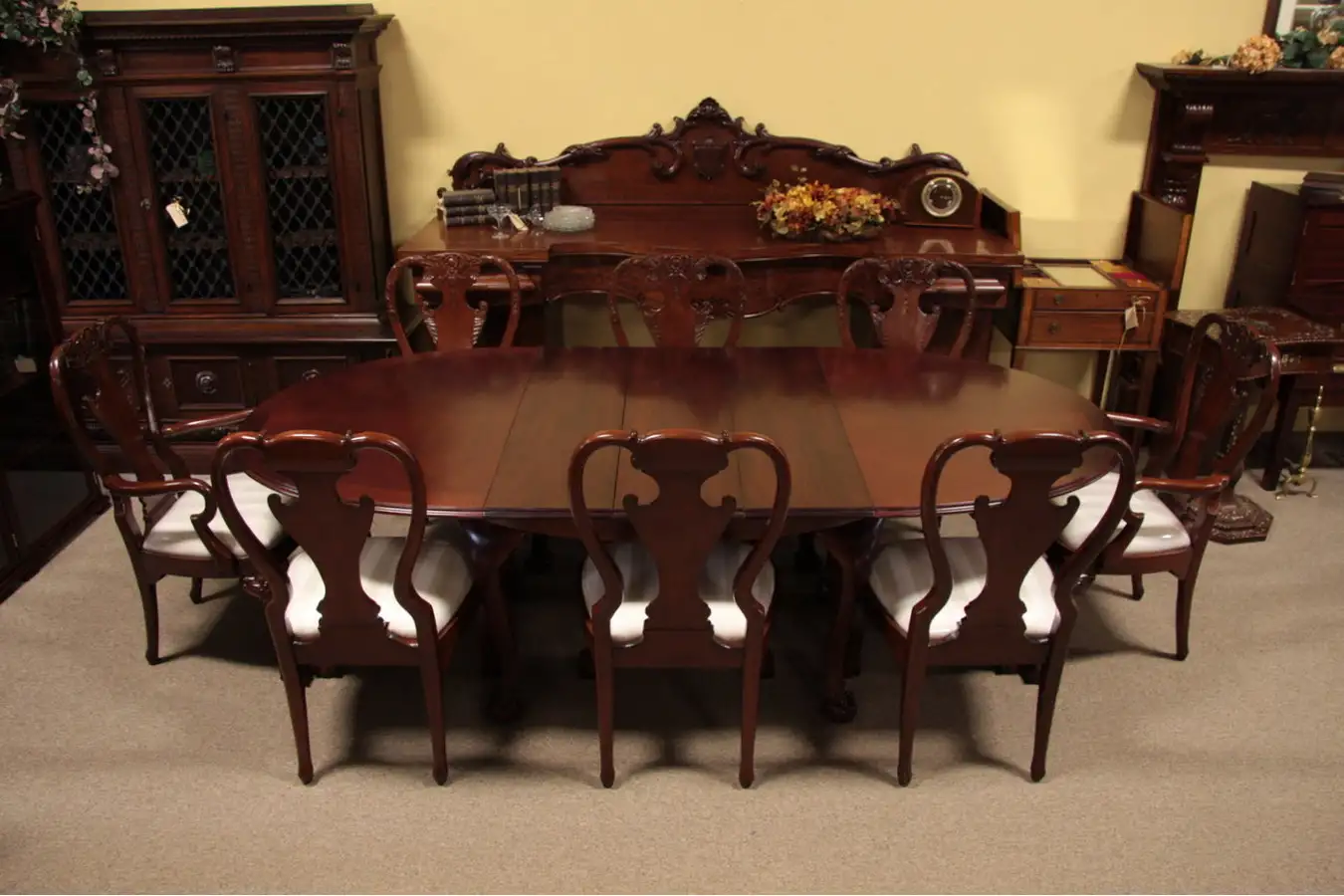 Richly carved in the Georgian or Chippendale style, this elegant dining set includes a table with 3 leaves and 8 chairs, all with claw and ball feet. The finish is excellent, and all pieces are totally solid and ready to use.