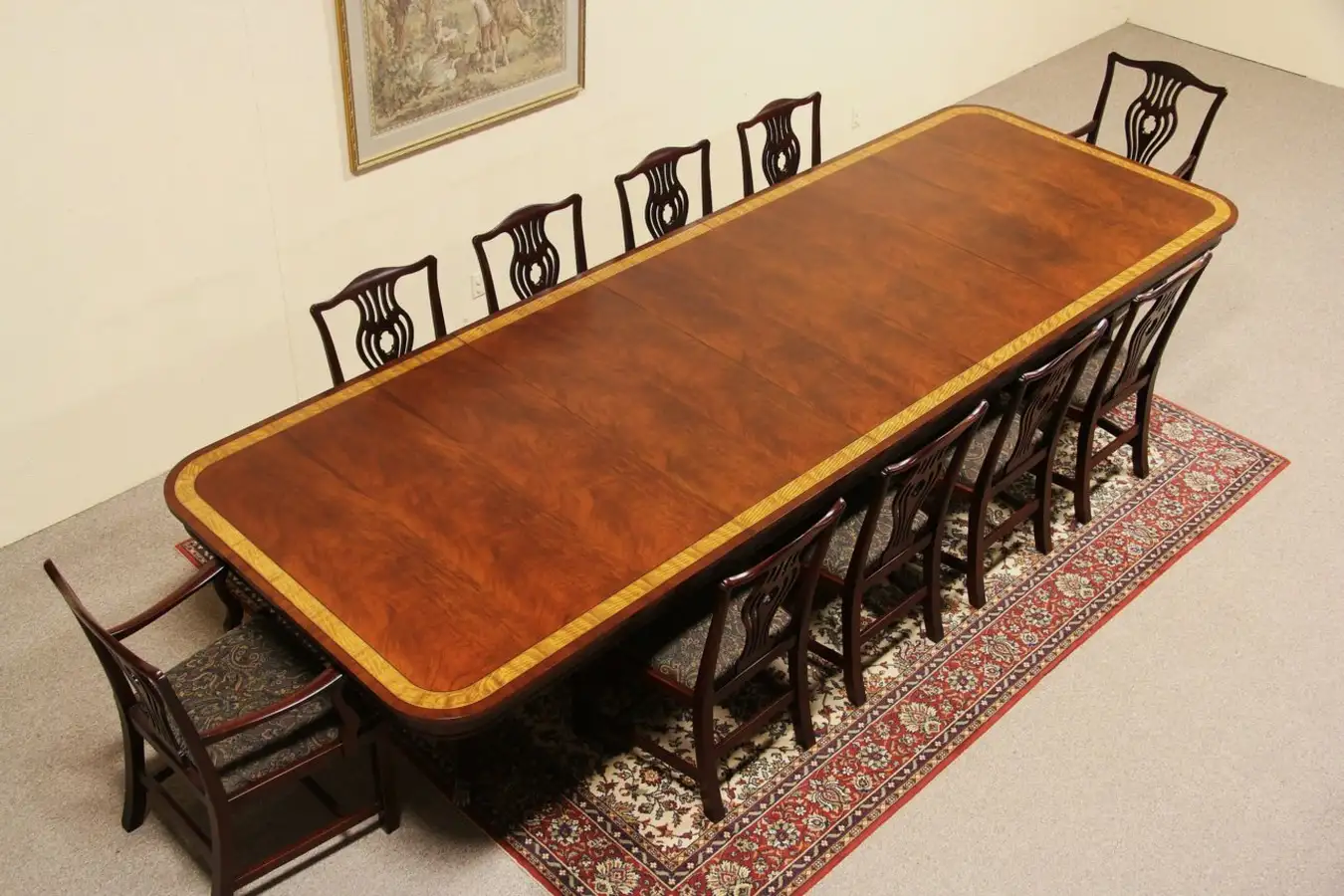 Traditional Georgian design is beautiful in this contemporary mahogany dining table with yew and ebony banding. The finish is in excellent condition.