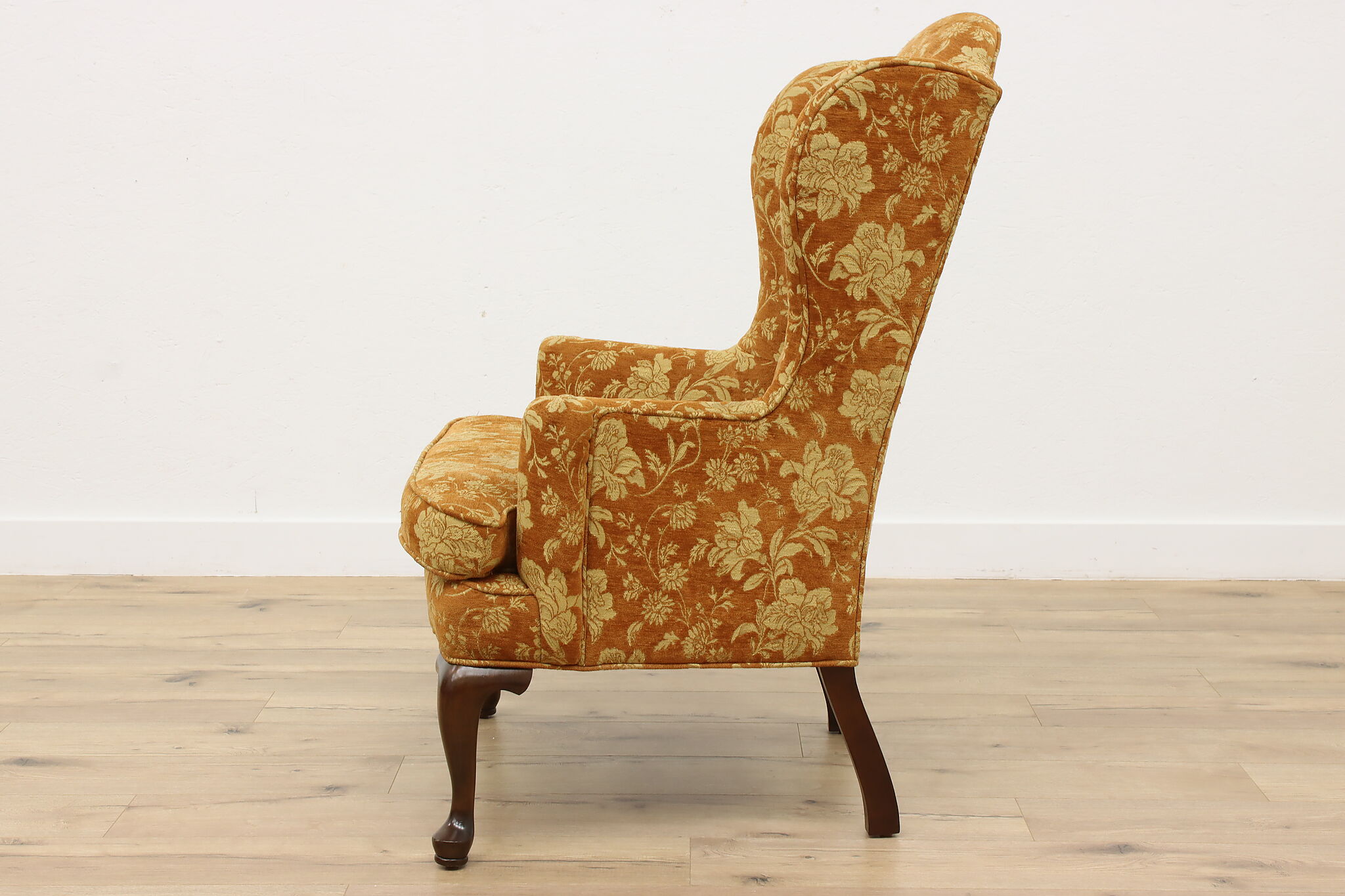 A Georgian design wingback chair has a lovely soft upholstery with floral motifs.