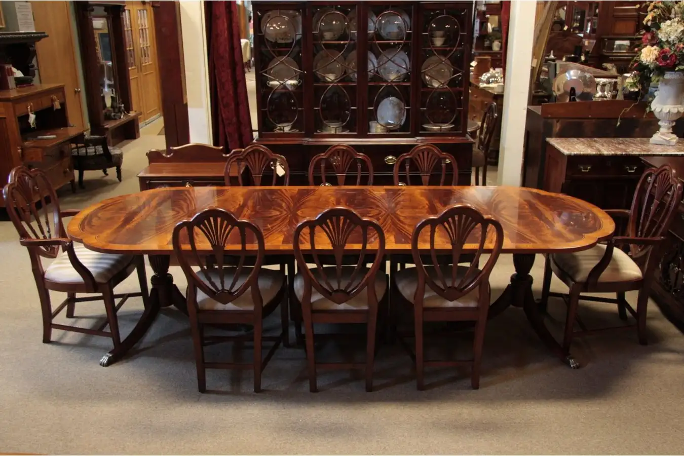 The stately elegance of 18th Century Georgian design is reflected in this beautiful dining set, including 8 carved solid mahogany chairs and a table with matched flame mahogany top and lavish banding that extends to 10.' There is no signature, but the table is said to be from famous maker "Hekman," and rests on two solid mahogany pedestals with brass feet. It has a polished top with almost no wear.