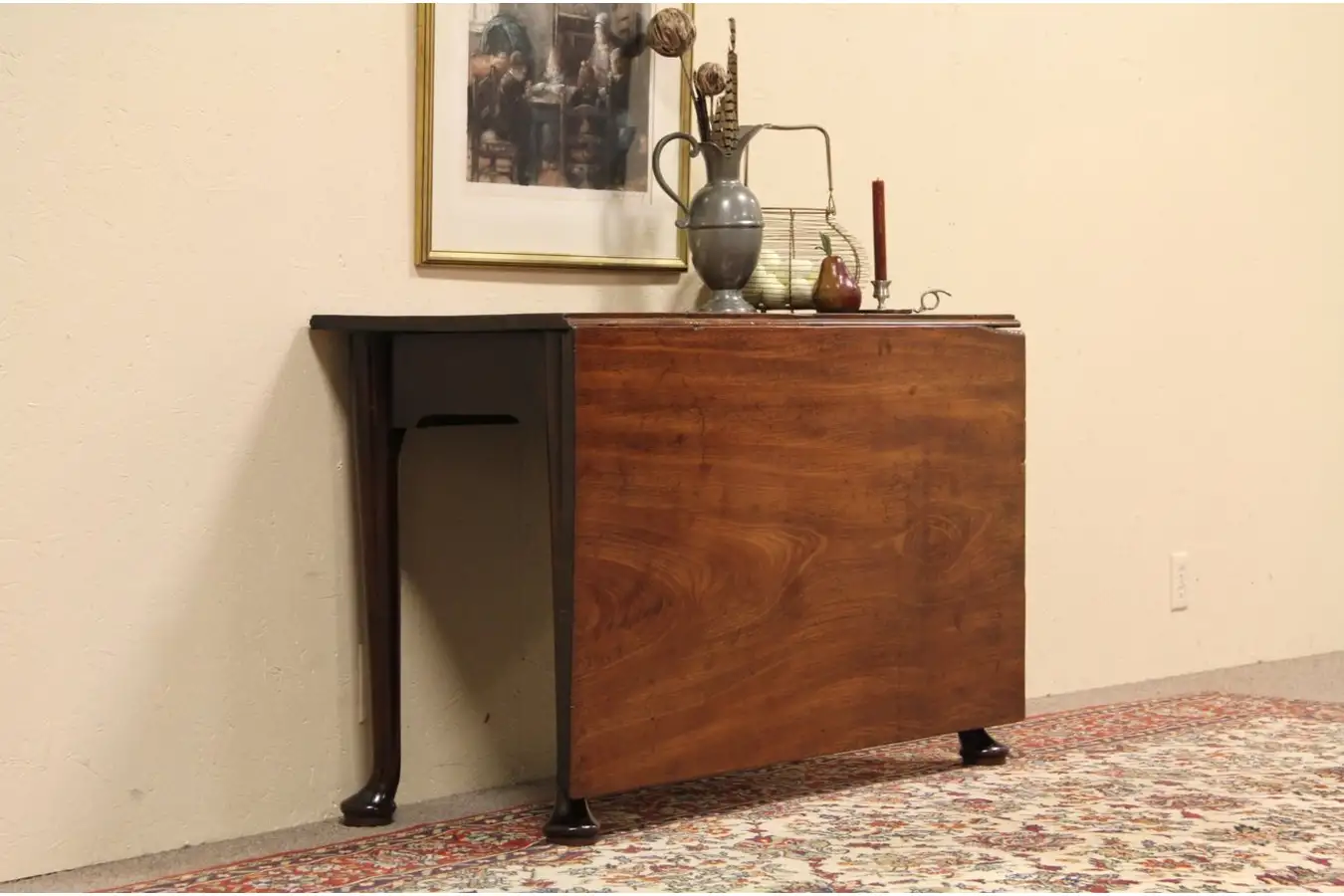 Measurements of this historic English table when closed are just over 45" wide, 19" deep and 29" tall, with the dropleaf raised, the top is 43 1/2" by just over 45."
