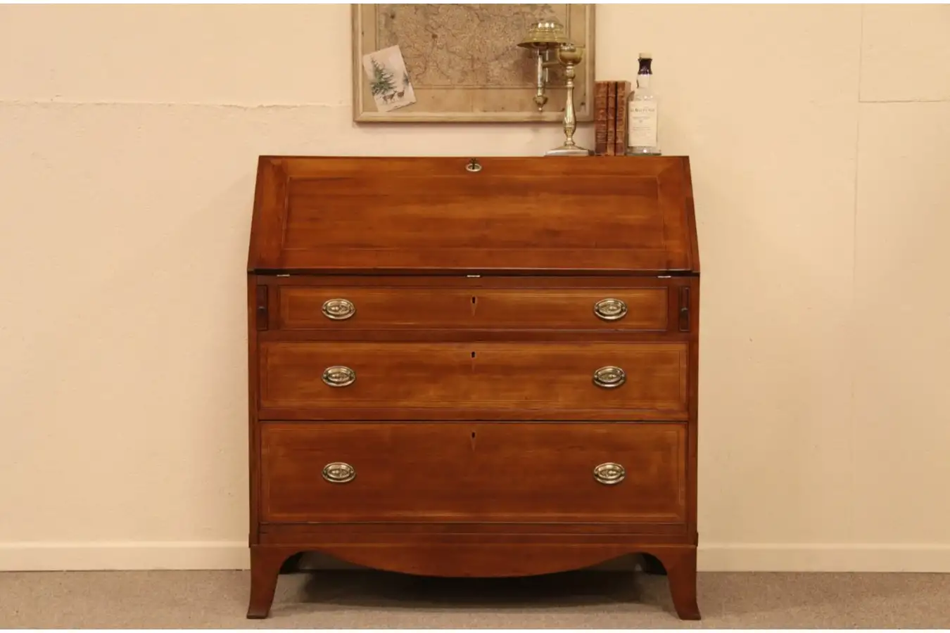 The drop-front writing surface rests on pull-out supports. Inside are tiny cubicles and drawers, a locking door gives access to tabs that open two "secret" drawers. The top left drawer inside bears a bequest inscription dated 1929, see photo.