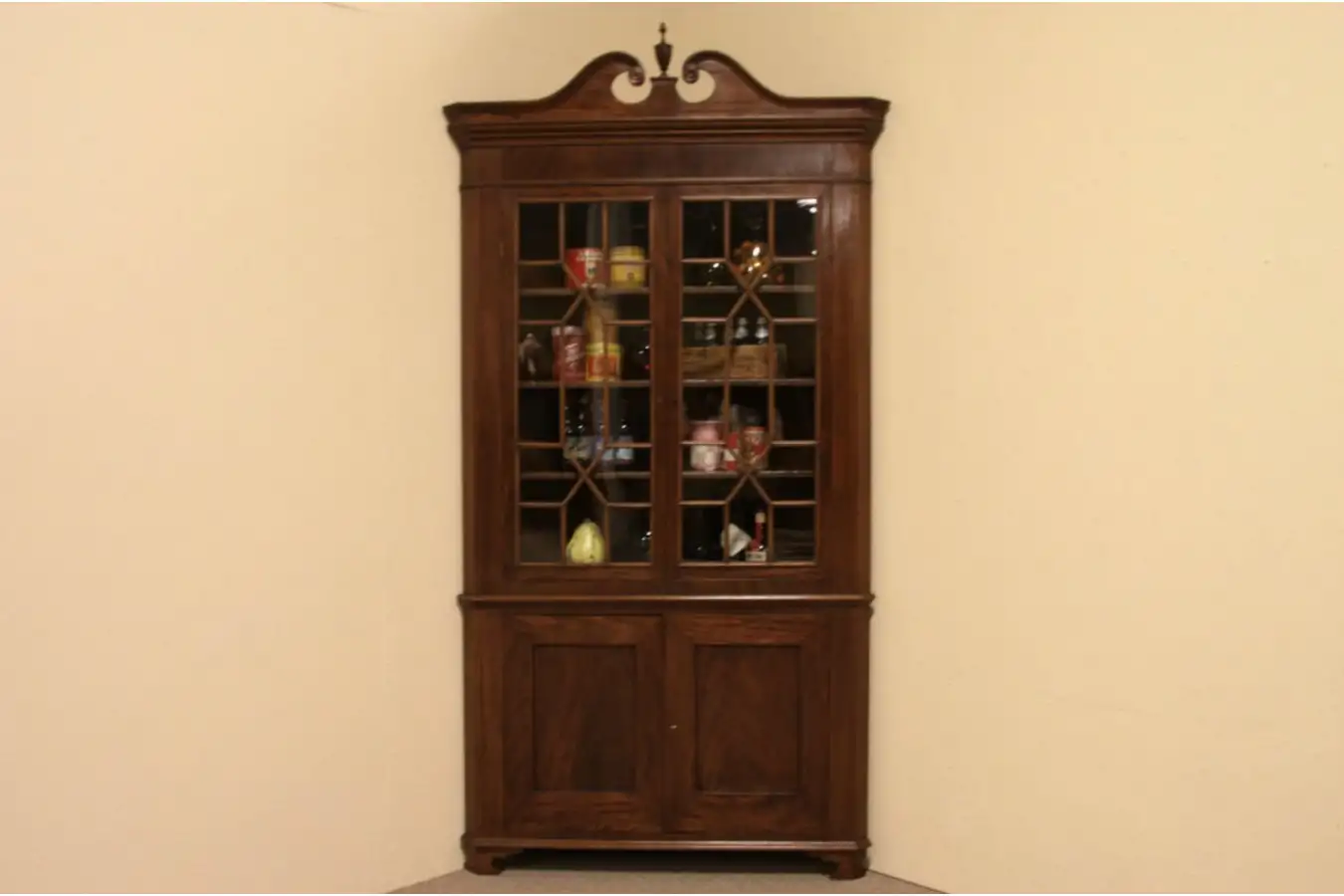 Small panes of wavy glass are beautiful on this American made furniture The rough sawn pine backside has square nail heads. Keys operate door locks. The finial in the pediment appears to be later. Moldings on interior shelves are later and removable, they make for easy plate display.