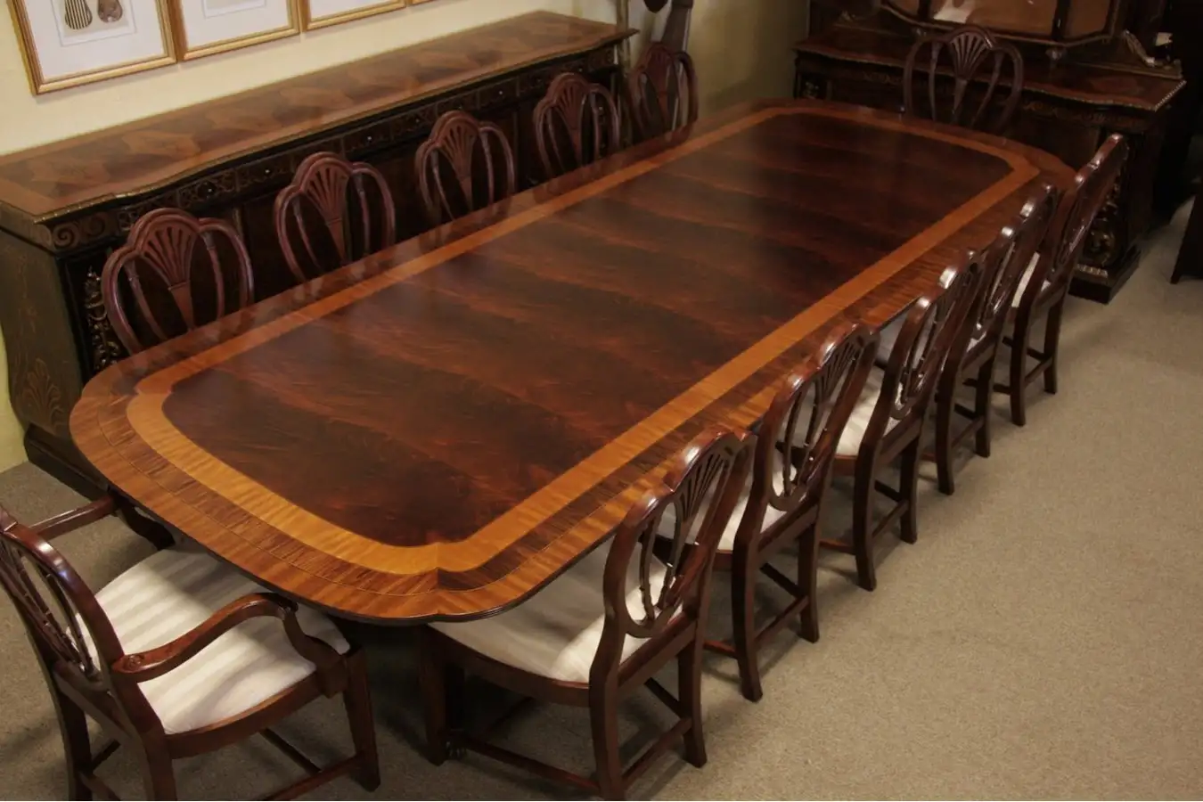 A stately Georgian style dining set includes an imposing table with matched flame grain mahogany and opulent banding in rosewood, satinwood and tulipwood. Twelve solid carved mahogany chairs include 2 with arms. Neutral upholstery on the soft cushions is easily replaced to match any decor. This set has been displayed, but was never used for a meal. The imposing table has a lustrous satin finish in impeccable condition and spectacular natural grain and color, note a tiny irregularity in the banding underneath the finish.