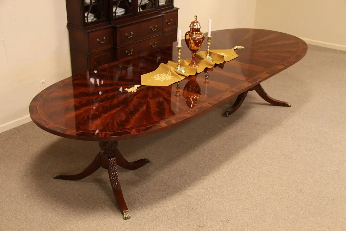 This dining table is a replica of 18th Century Georgian or Federal Period furniture. These famous designs are prestigious classics, which are new or almost new from famous American table makers. Sometimes they are from designer showrooms, furniture trade shows, or custom order cancellations. Tables are offered at a price far less than furniture stores, and therefore the original signatures are removed by the makers. After carefully inspecting these traditional tables are polished as needed. There are only very tiny mars or scratches, and we proudly present this historic and impeccable furniture at remarkable savings.