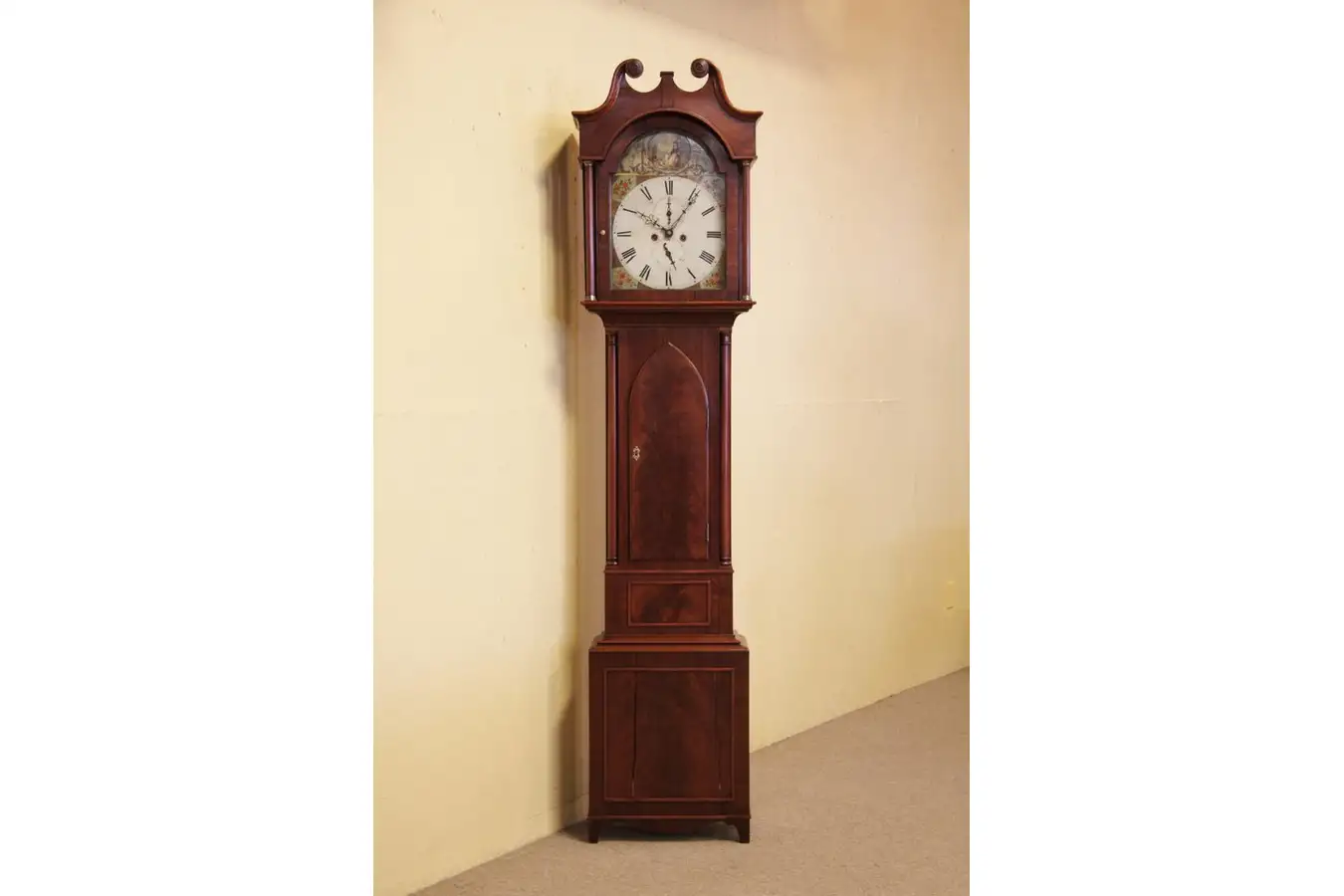 This stately Georgian Scottish tall case or grandfather clock from the capital city of Edinburgh is in excellent running condition and dates from the 1820's. Mahogany with shaped columns, the case has a very fine finish, enhancing the beautiful flame grain panels and door. Note old shrinkage cracks typical on furniture of this age.