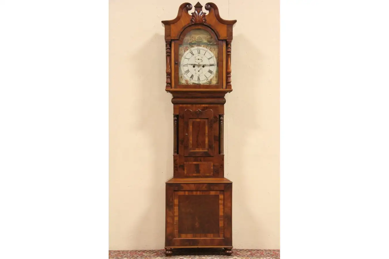 An authentic Georgian period tall case or grandfather clock was hand crafted about 1825, signed "Demfries" or modern "Dunfries," a river city near the coast.