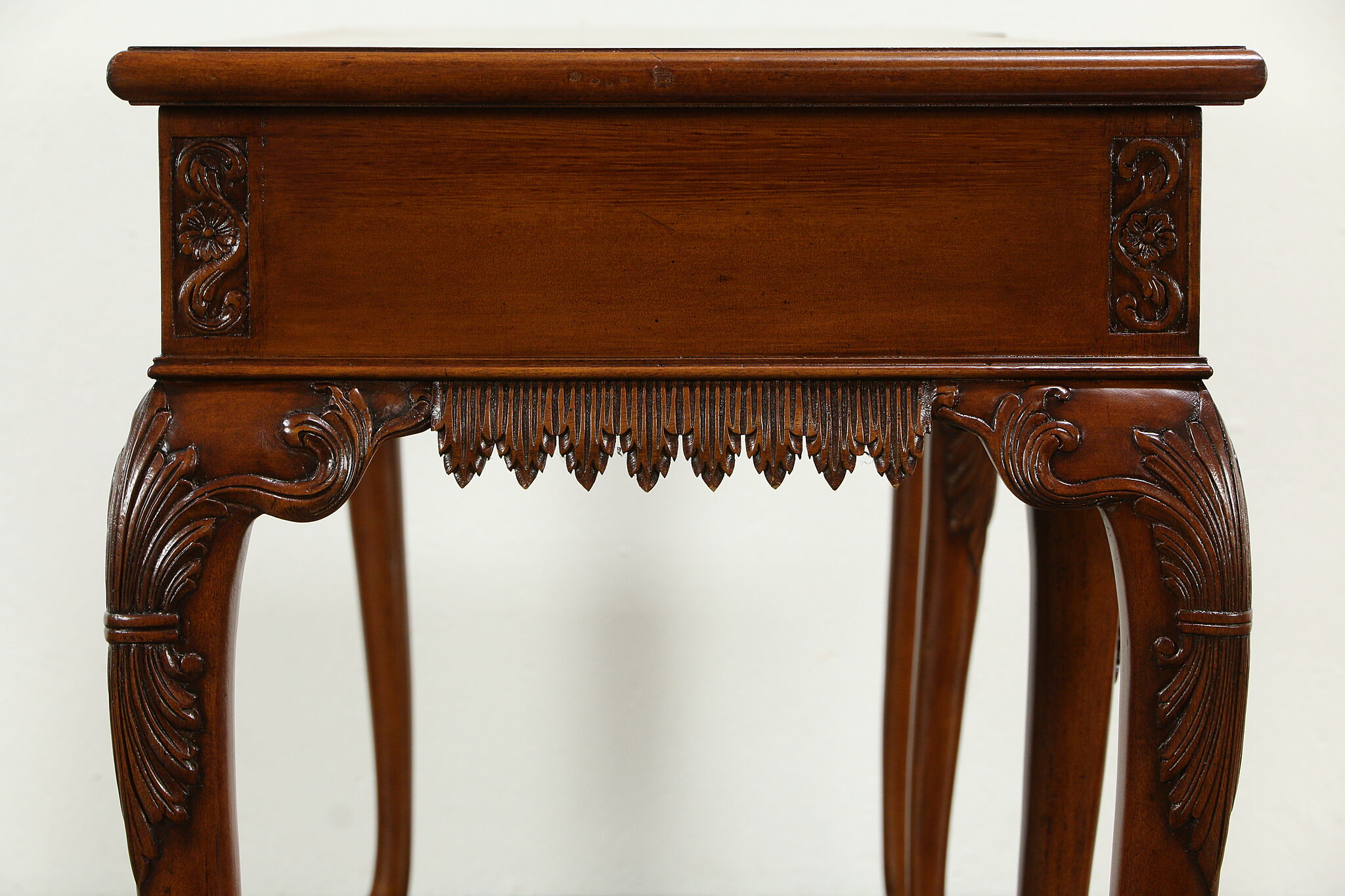 A traditional Georgian style mahogany hall console, sofa table or sideboard from around 25 years ago is signed "Ardley Hall" on a brass plaque. Carved ball and claw feet and fine detailing are authentic on this vintage furniture.