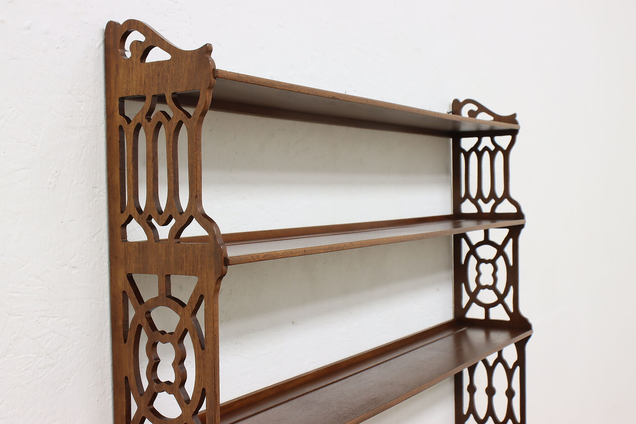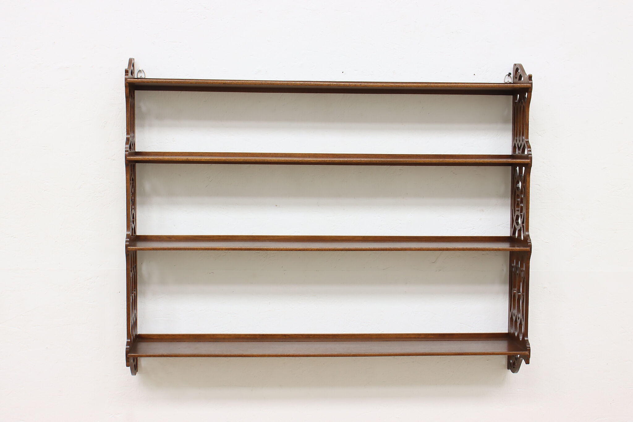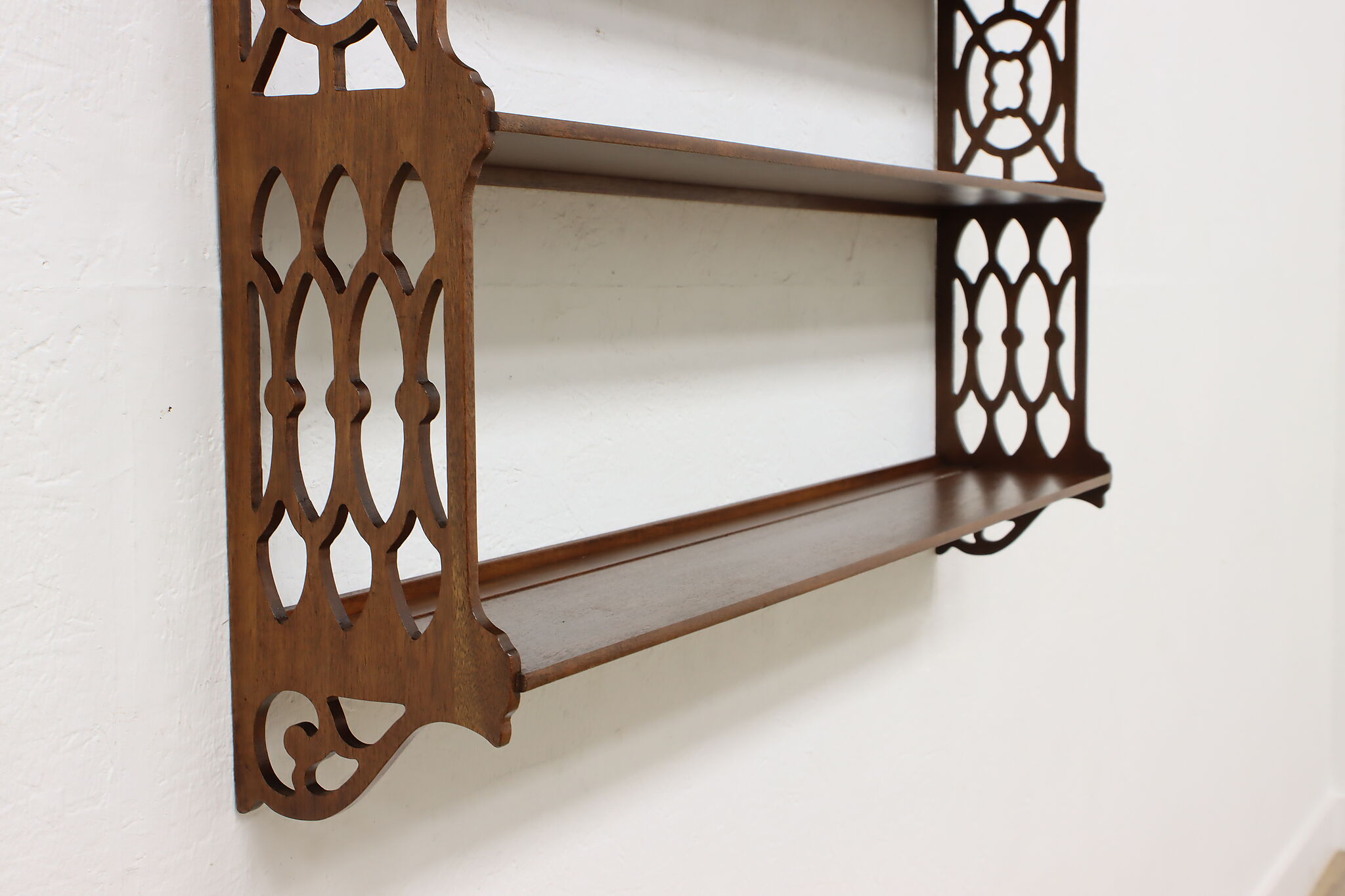 Want to display your grandparent's fine china or knickknacks? This wall hanging shelf is an excellent option with its charmingly carved sides for a bit of simple beauty.