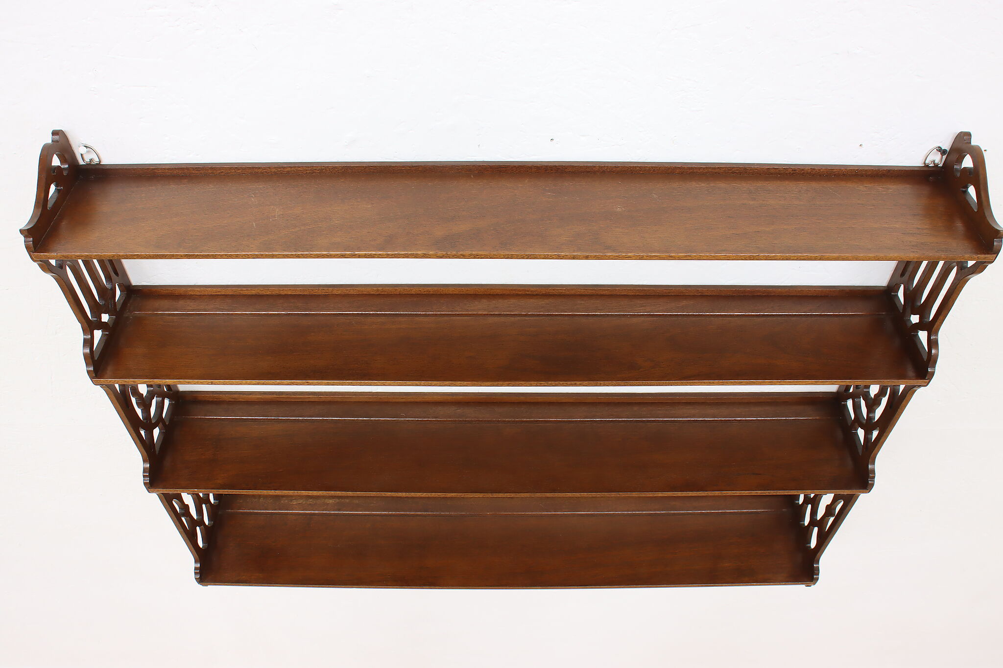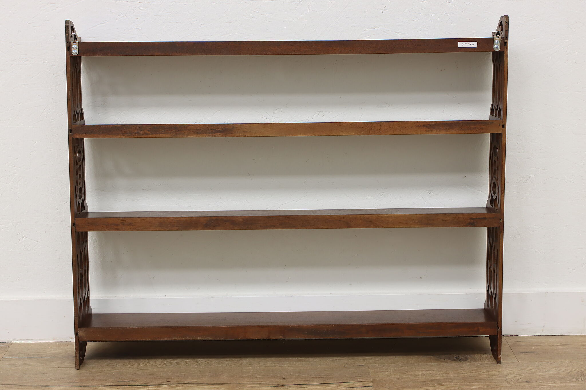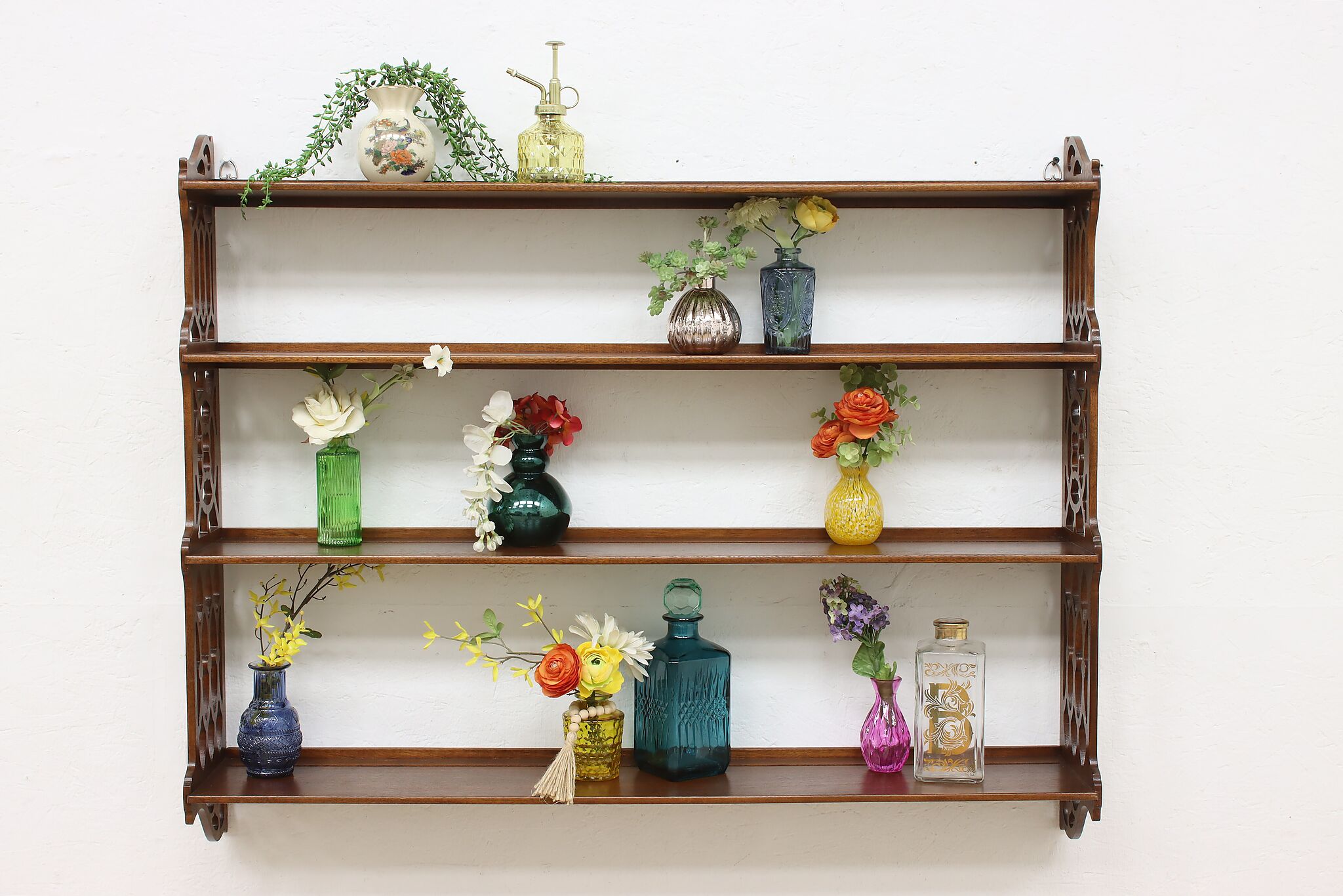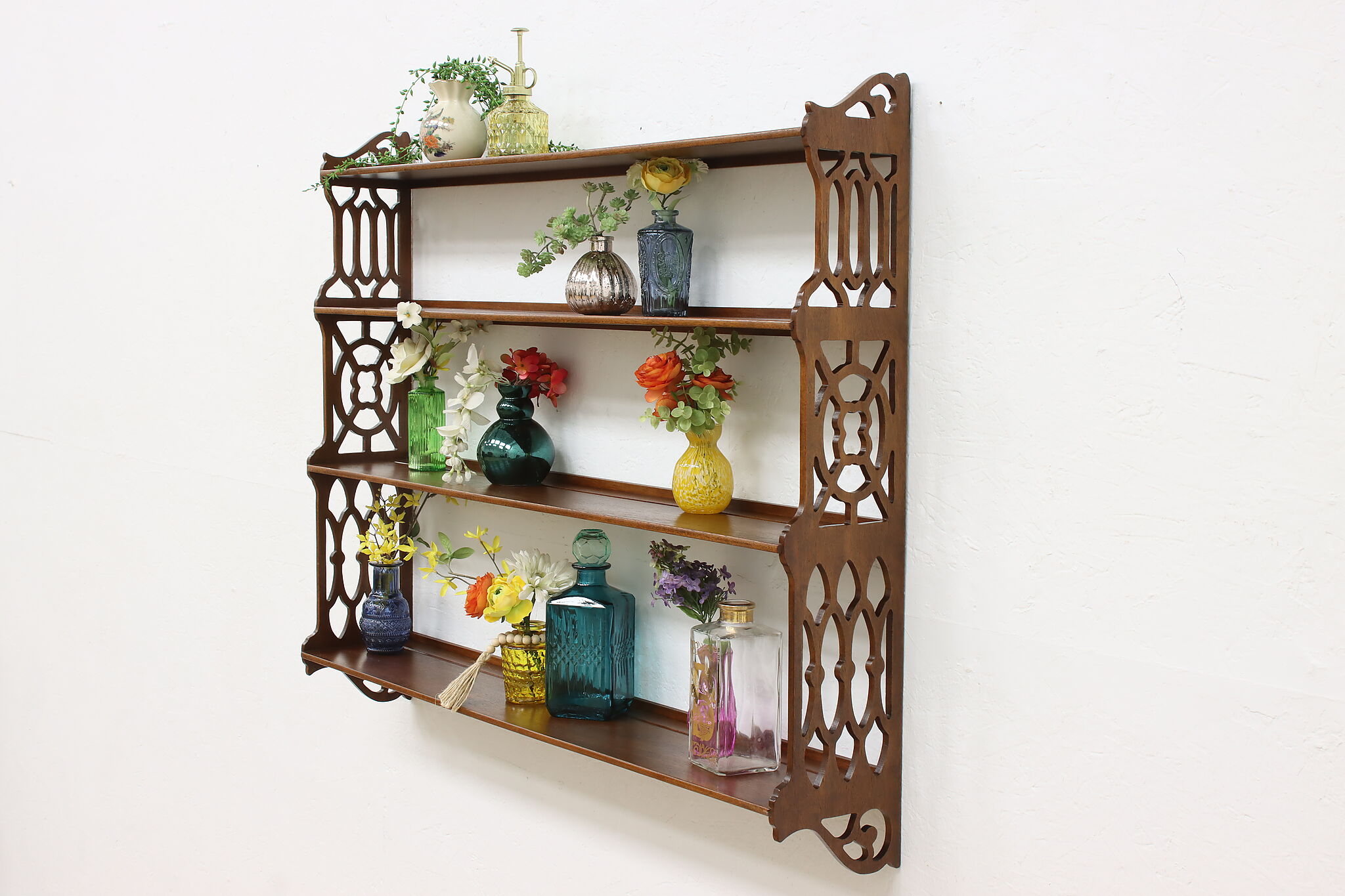 Want to display your grandparent's fine china or knickknacks? This wall hanging shelf is an excellent option with its charmingly carved sides for a bit of simple beauty.