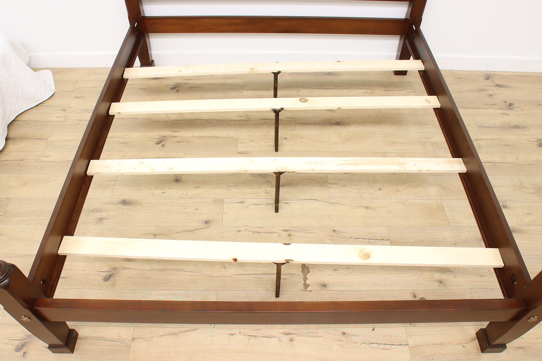 Bed size is 88.5" long and 82" wide. Headboard is 40" tall. Overall height is 79.5" and without finials, height is 72.5". Slats sit 14.5" from ground and the demonstrator mattress is 16" thick. Interior dimensions of the bed frame are 81” long and 75” wide.
