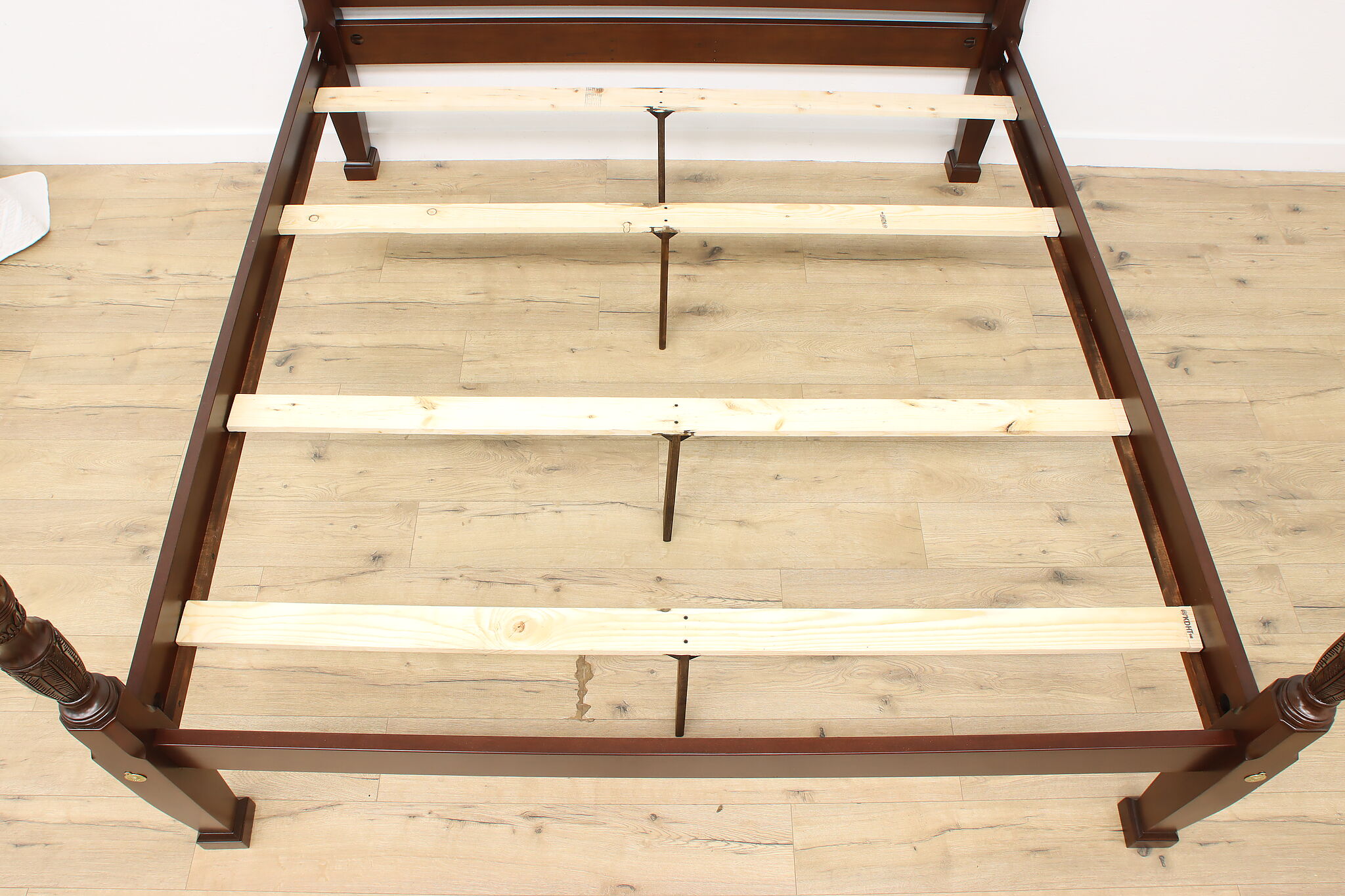Bed size is 88" long and 82.5" wide. Headboard is 46.5" tall. Overall height is 87" and without finials, height is 78.5". Slats sit 19" from ground and the demonstrator mattress is 16" thick. Interior dimensions of the bed frame are 80” long and 76” wide.