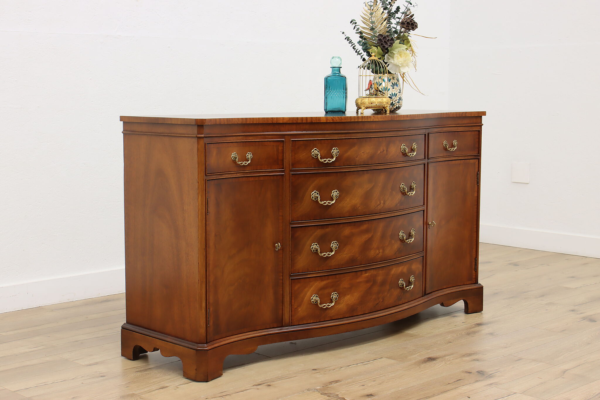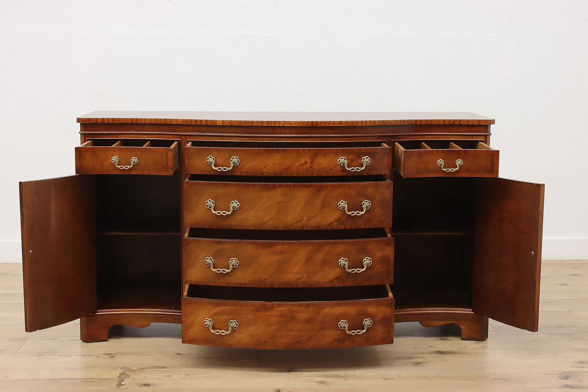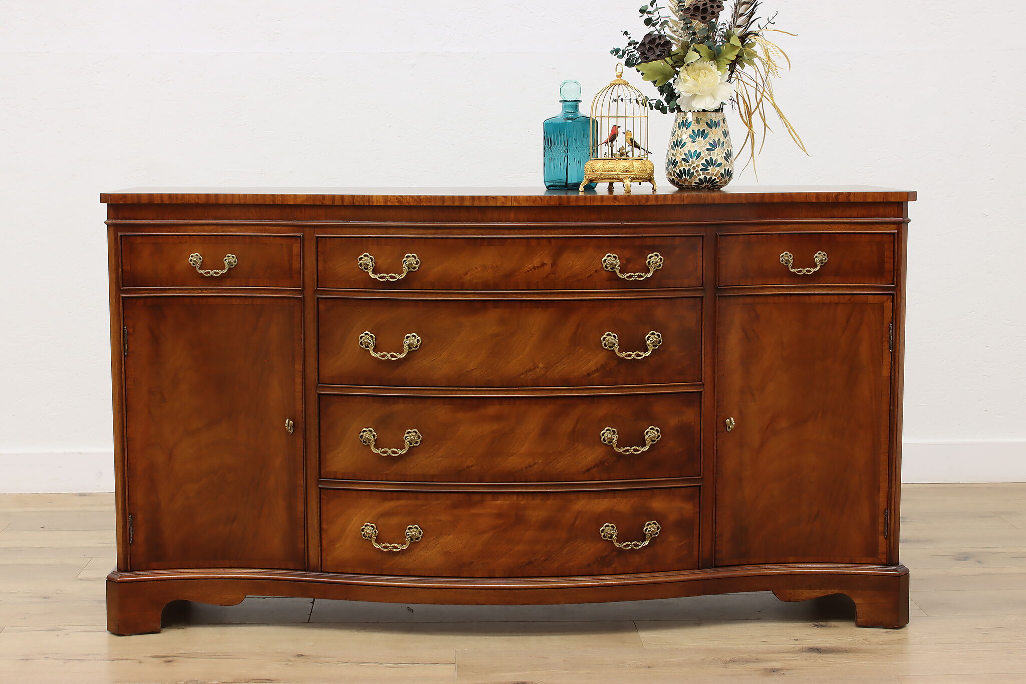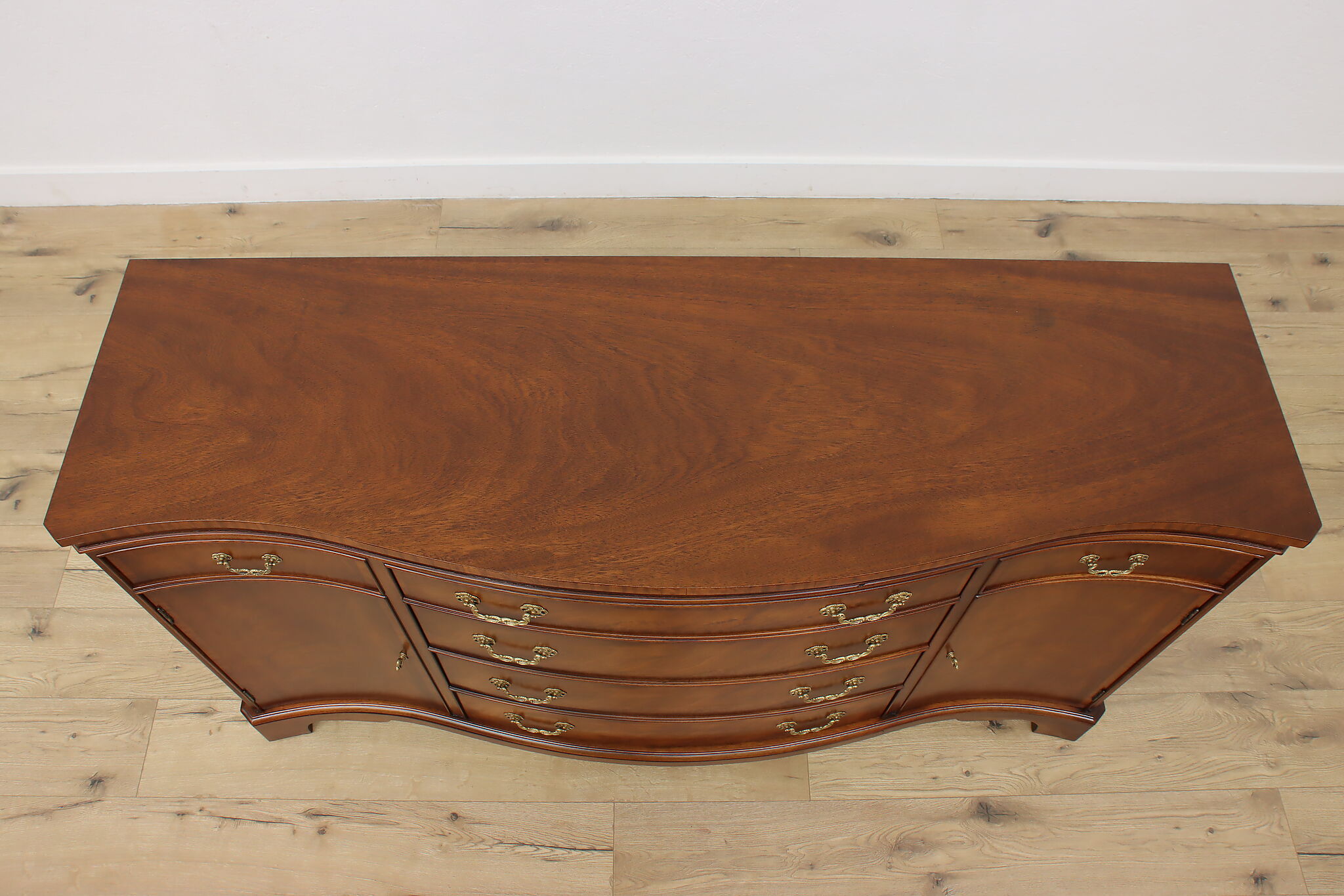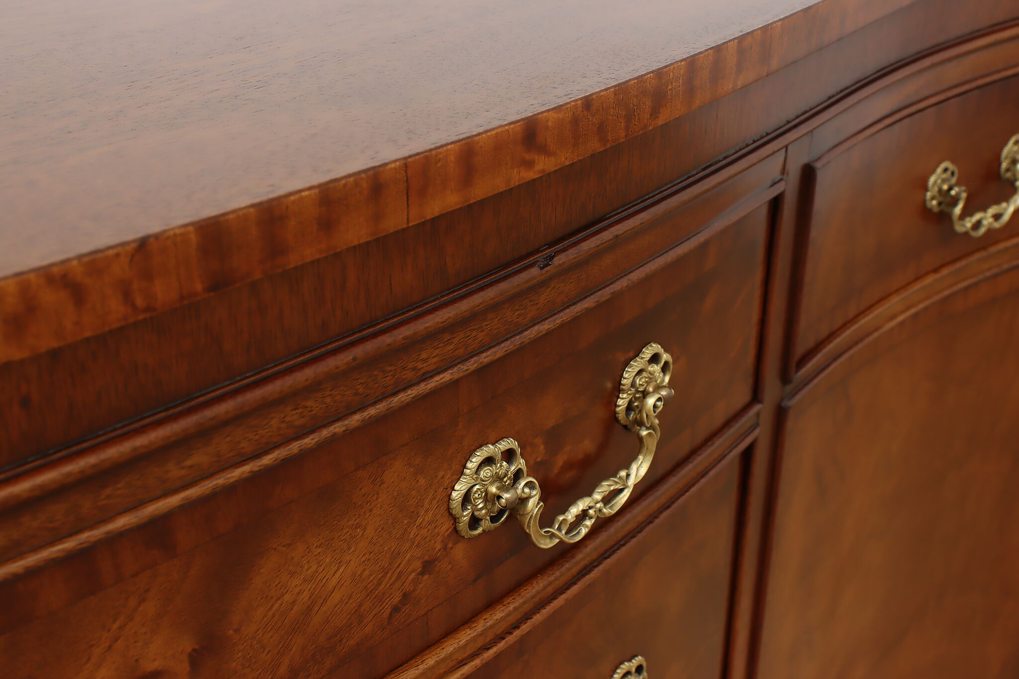 A carefully curated collection of furniture can turn a plain room into a sophisticated space by adding elegant pieces such as this Georgian design buffet or bar cabinet with a gracefully curved serpentine front.