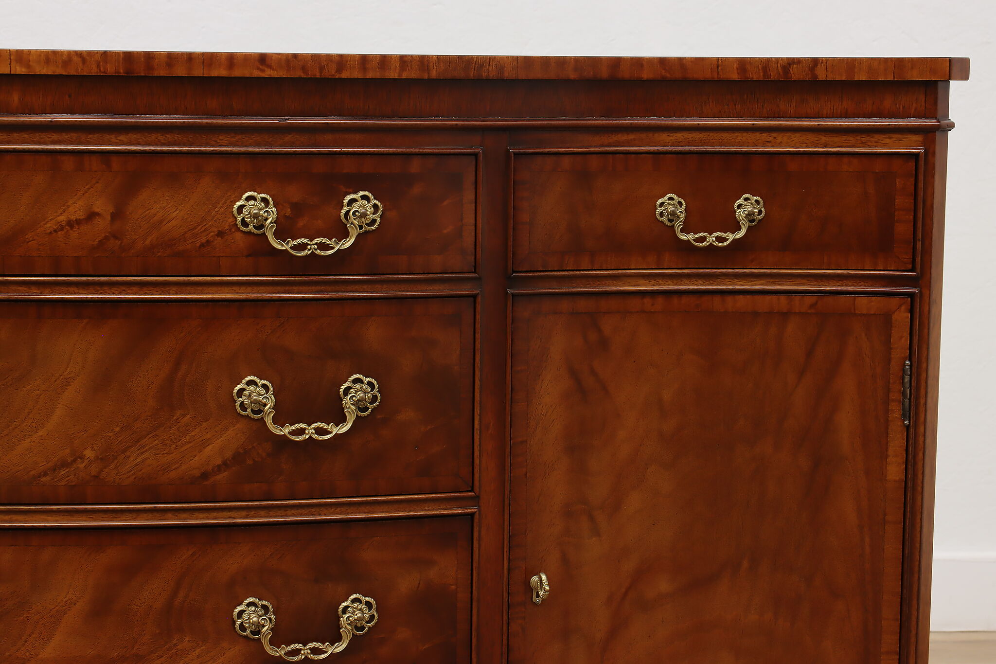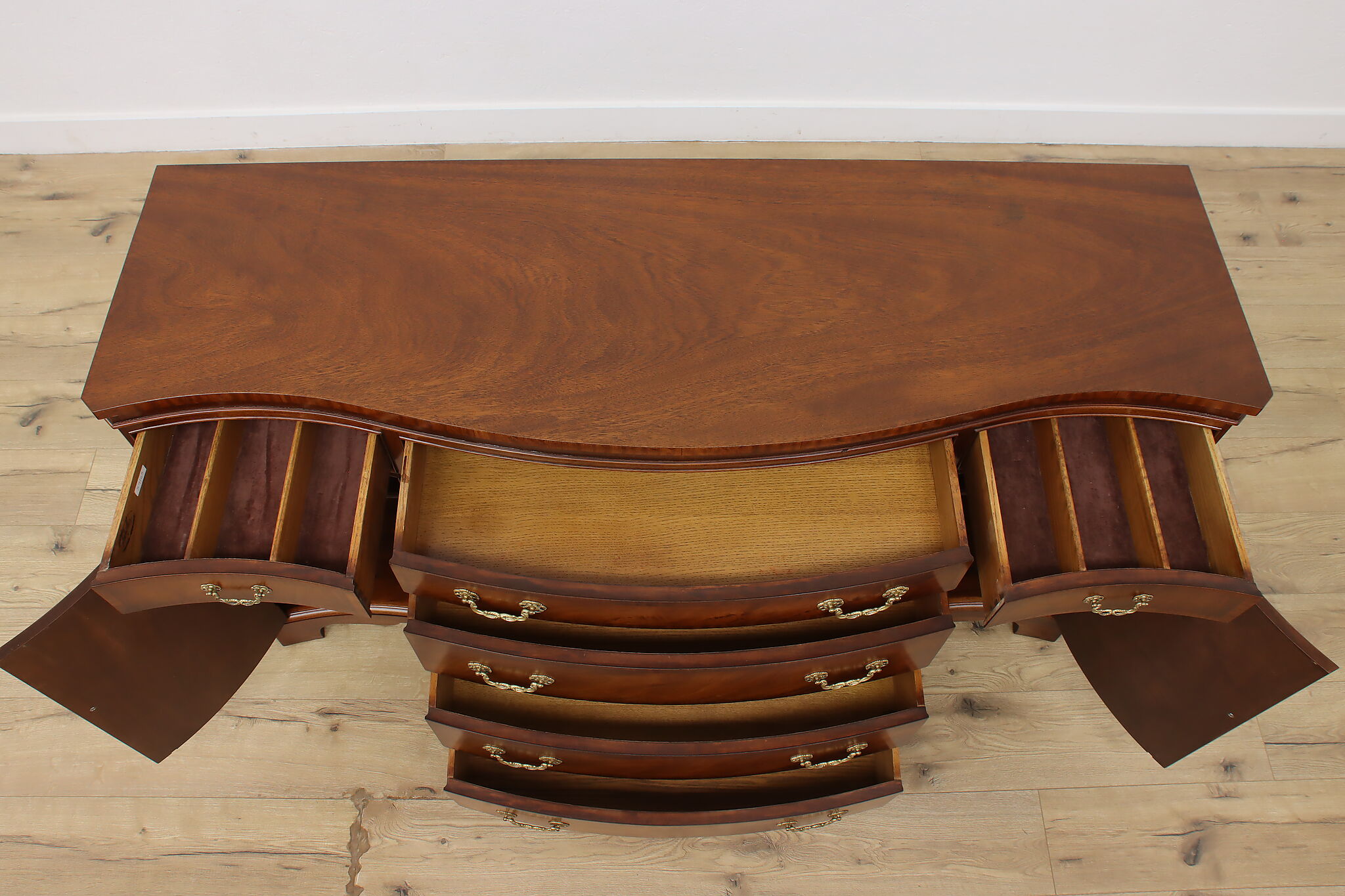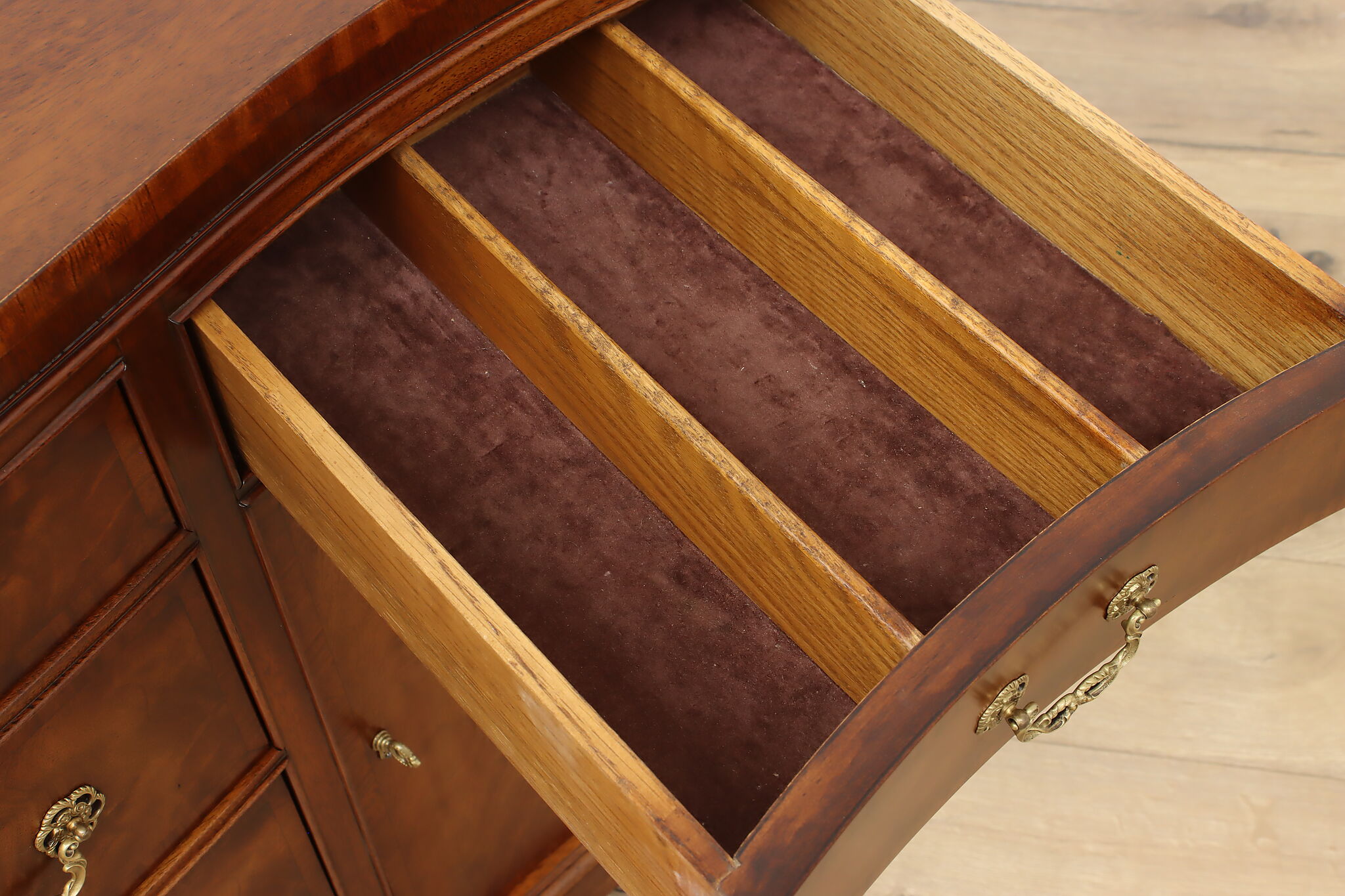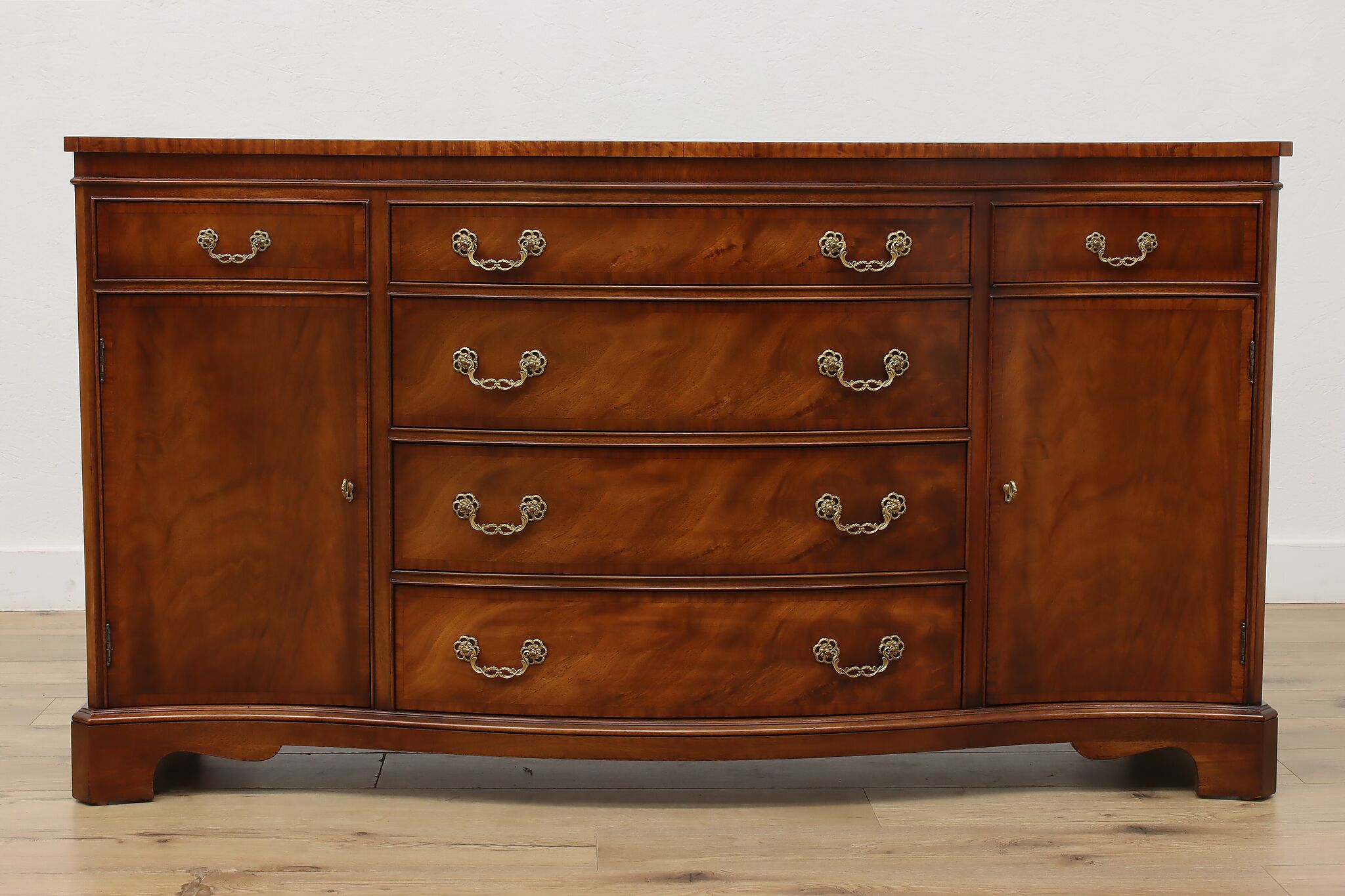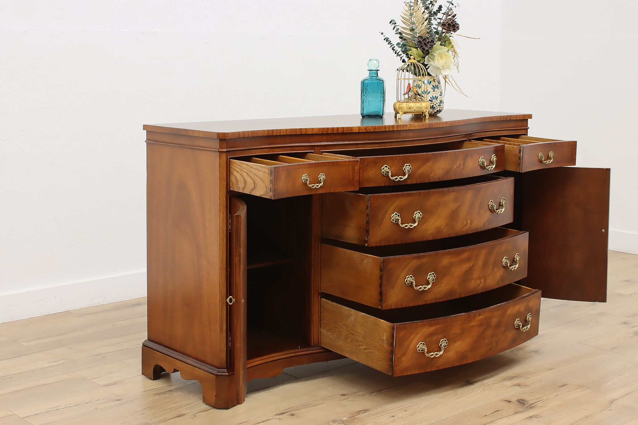 A carefully curated collection of furniture can turn a plain room into a sophisticated space by adding elegant pieces such as this Georgian design buffet or bar cabinet with a gracefully curved serpentine front.