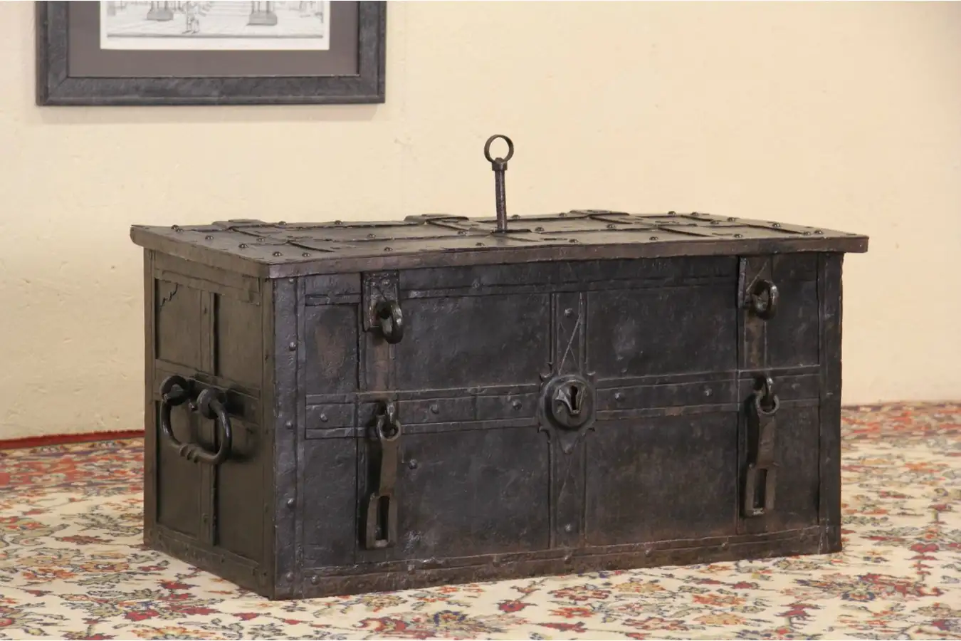 This spectacular hand wrought iron strongbox, safe or treasure chest was crafted in Germany in the 1700's.