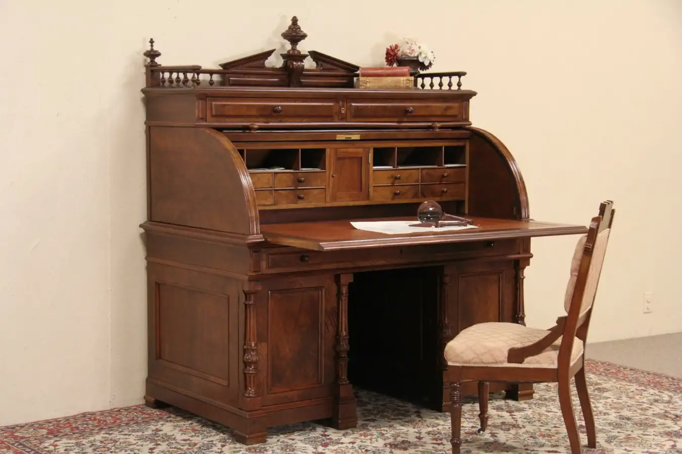 There are small mars and shrinkage separations from age, see photos. Hand carved details, knobs and finials are all original. The roll glides smoothly, inside is a pull out writing surface inlaid with leather. There are no keys except for the small door inside. Drawers have solid oak sides with hand cut dovetail joints and chamfered bottoms.