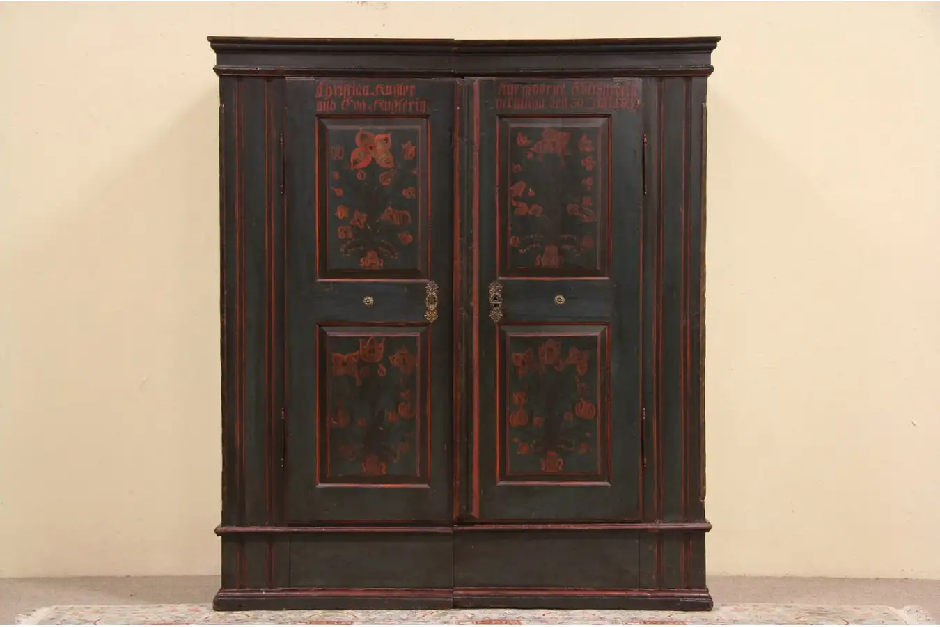 A traditional German matrimonial "Schrank" or armoire is signed "Christian Rugler & Eva Ruglerin . . . Vermahlt (Married) 30 Juli, 1839."