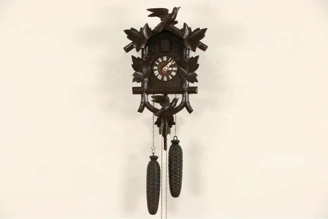 A door opens and the cuckoo bird pops out to "sing" the half hour and count the hour. Iron pine cone weights are wound by pulling the chain every few days.