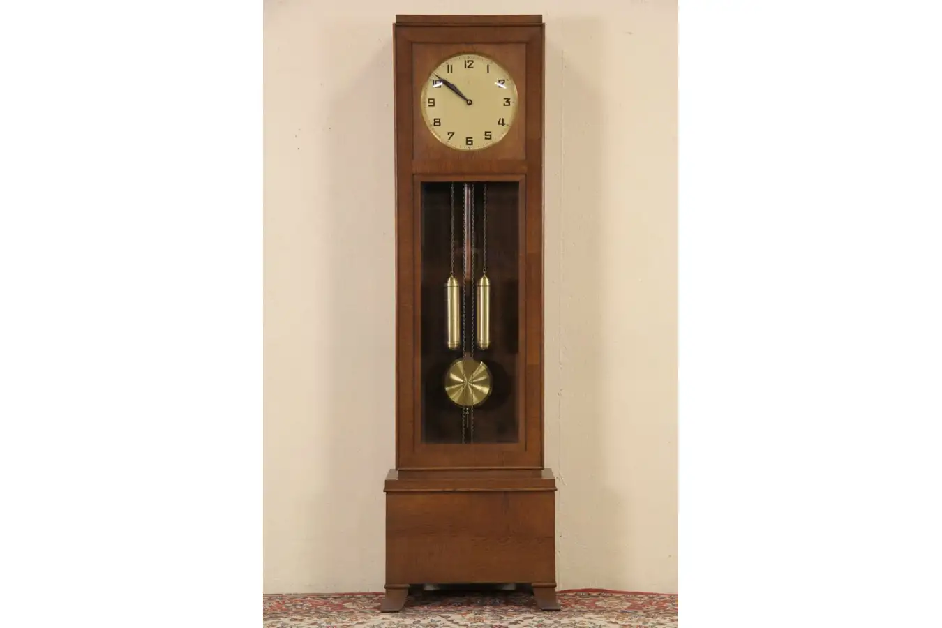 Expertly crafted about 1920, this tall or long case "grandfather" clock is all original. The double arrow trademark was used by the "Hamburg American Clock Co." of Hamburg, Germany from 1882-1926.