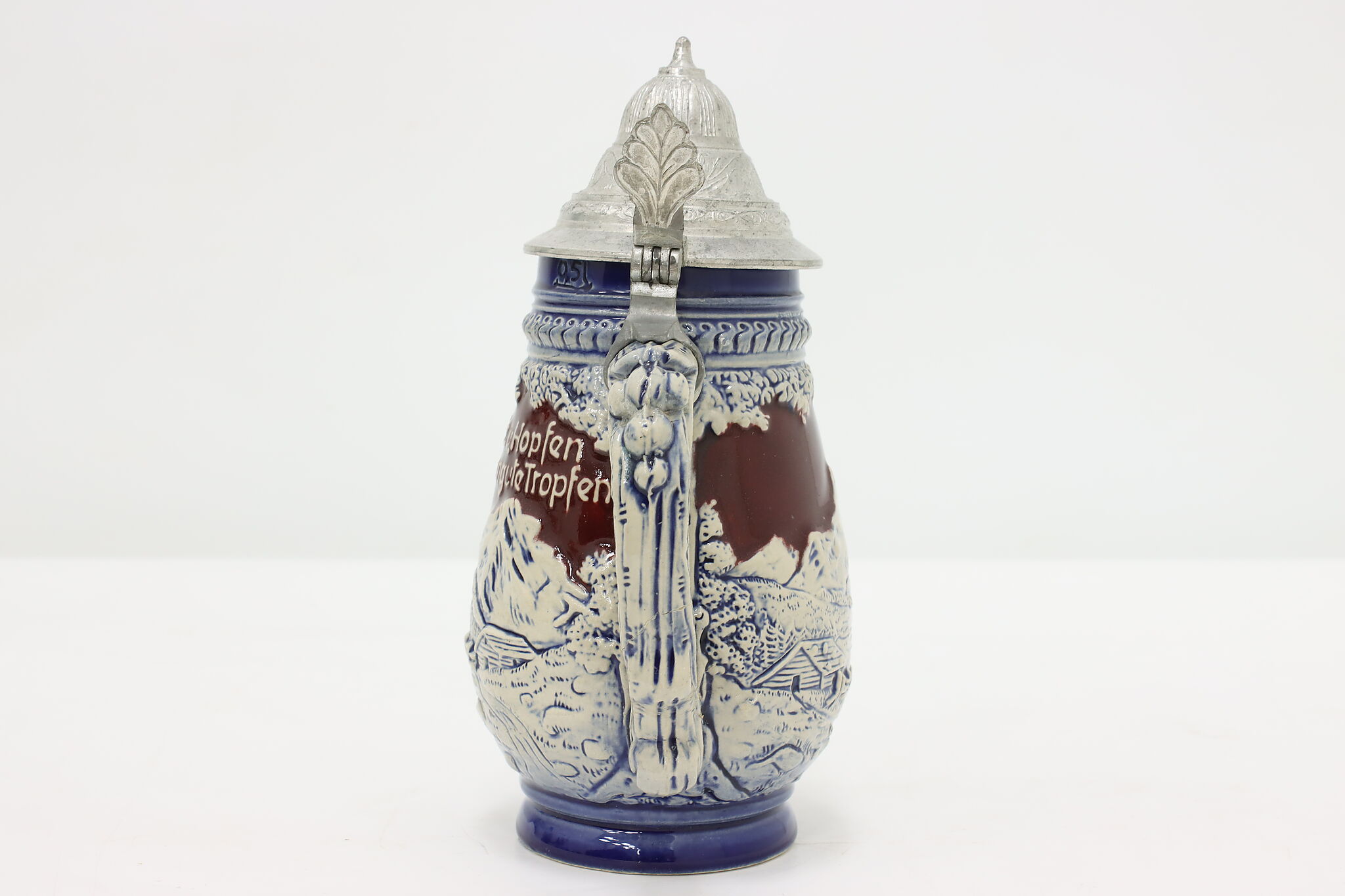 A wonderfully hand-painted beer stein or mug is inscribed "Malz und Hopfen geben gute Tropfen", German for "Malt and hops give good drops."