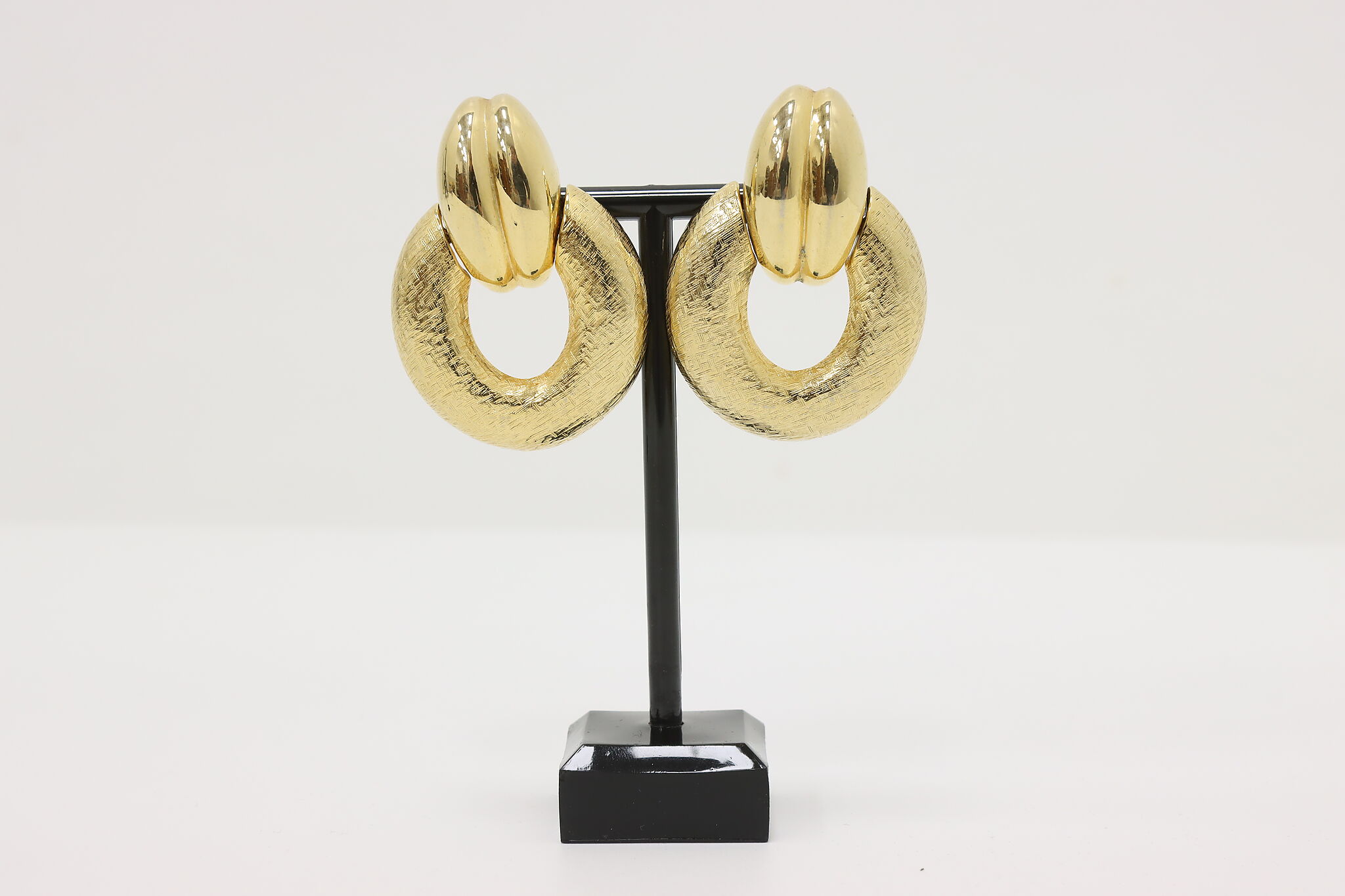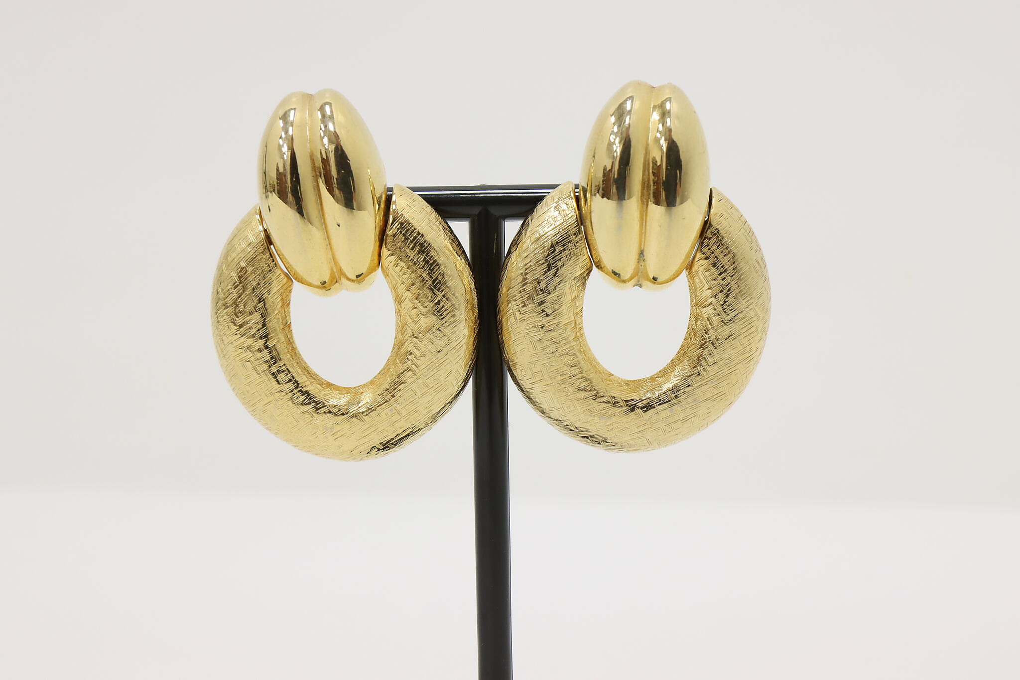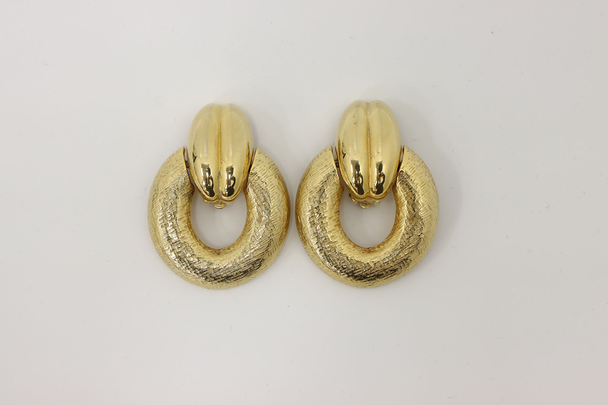 A bold pair of vintage gold-tone clip-on earrings featuring a textured circular drop and smooth polished top.