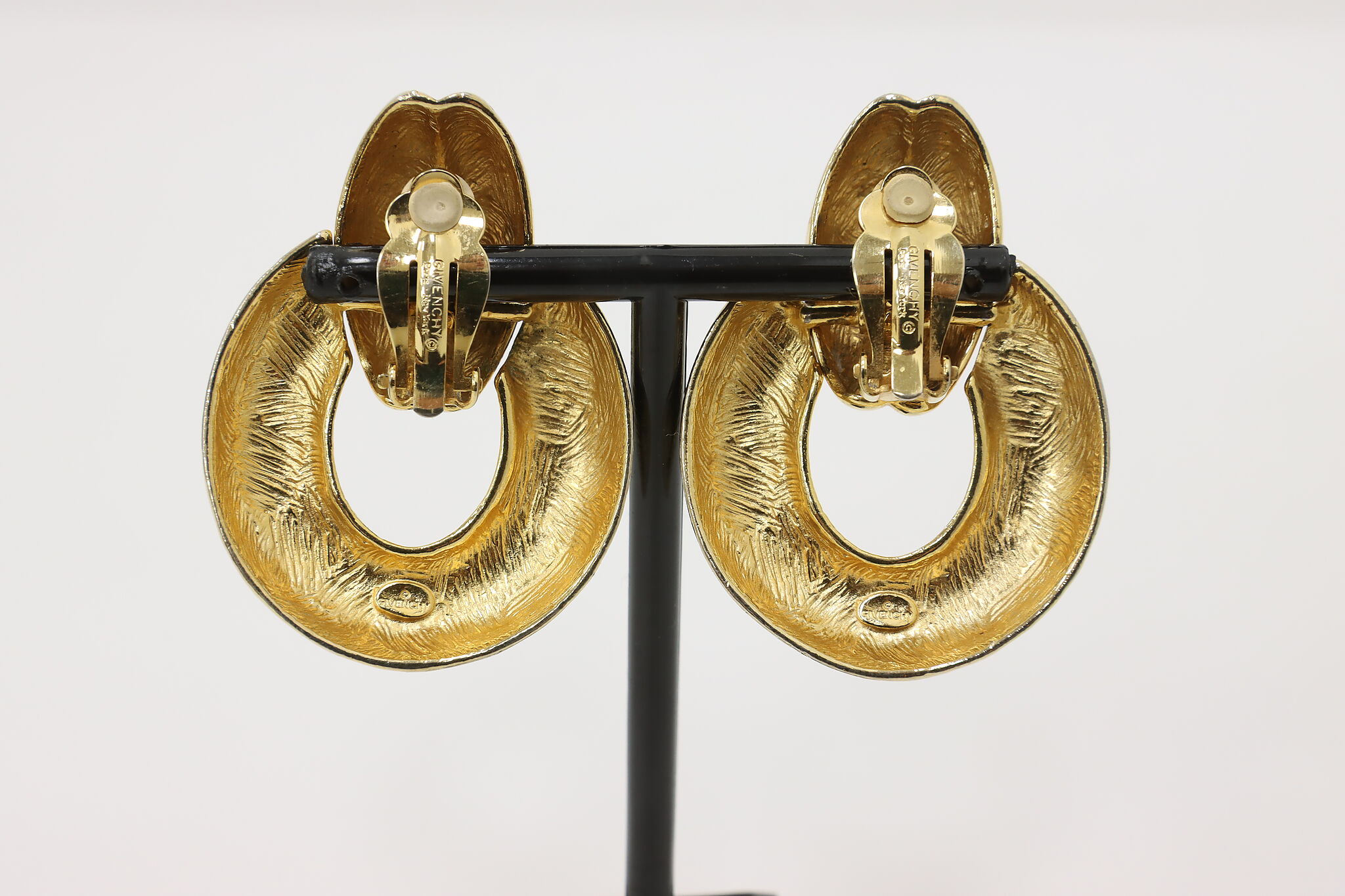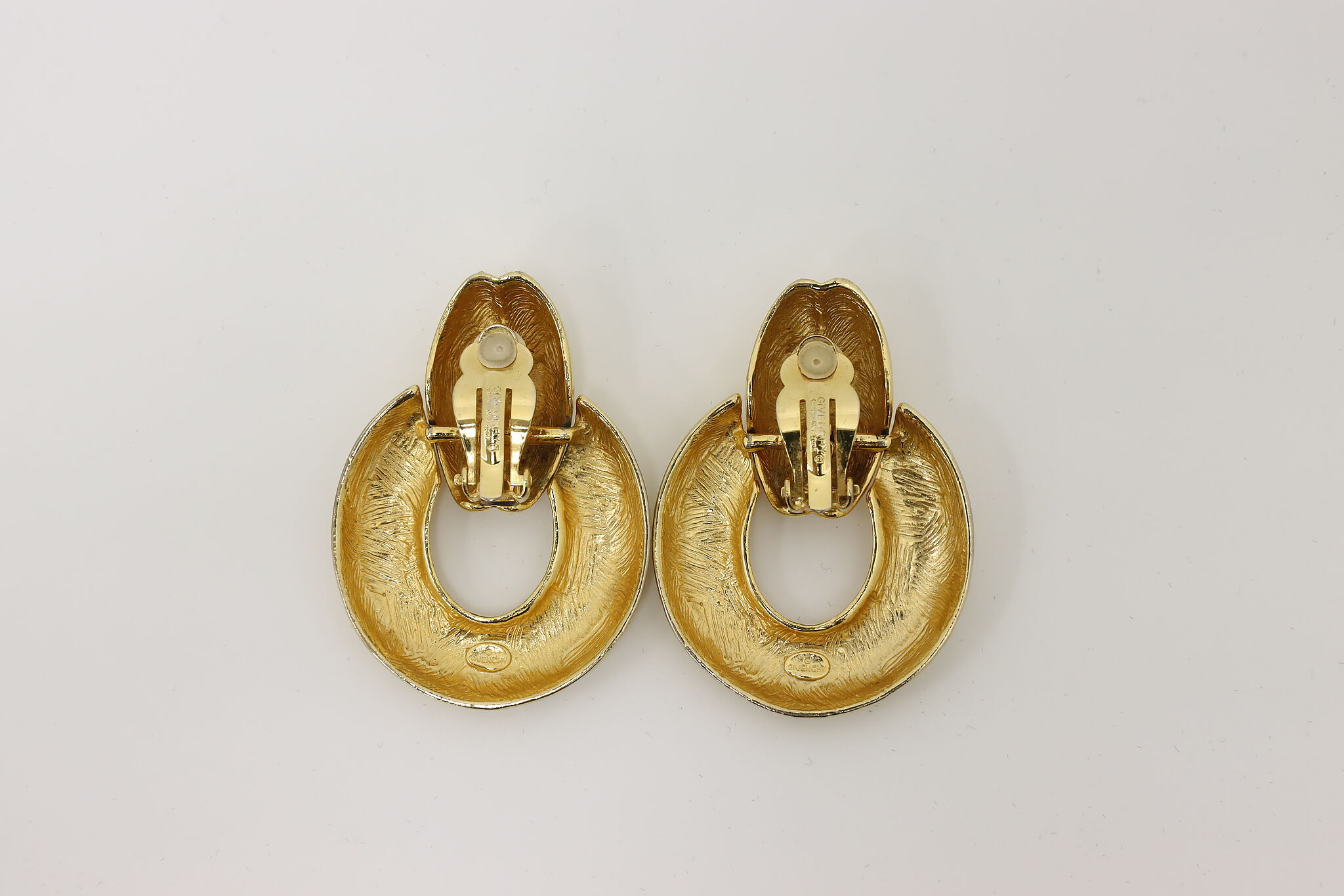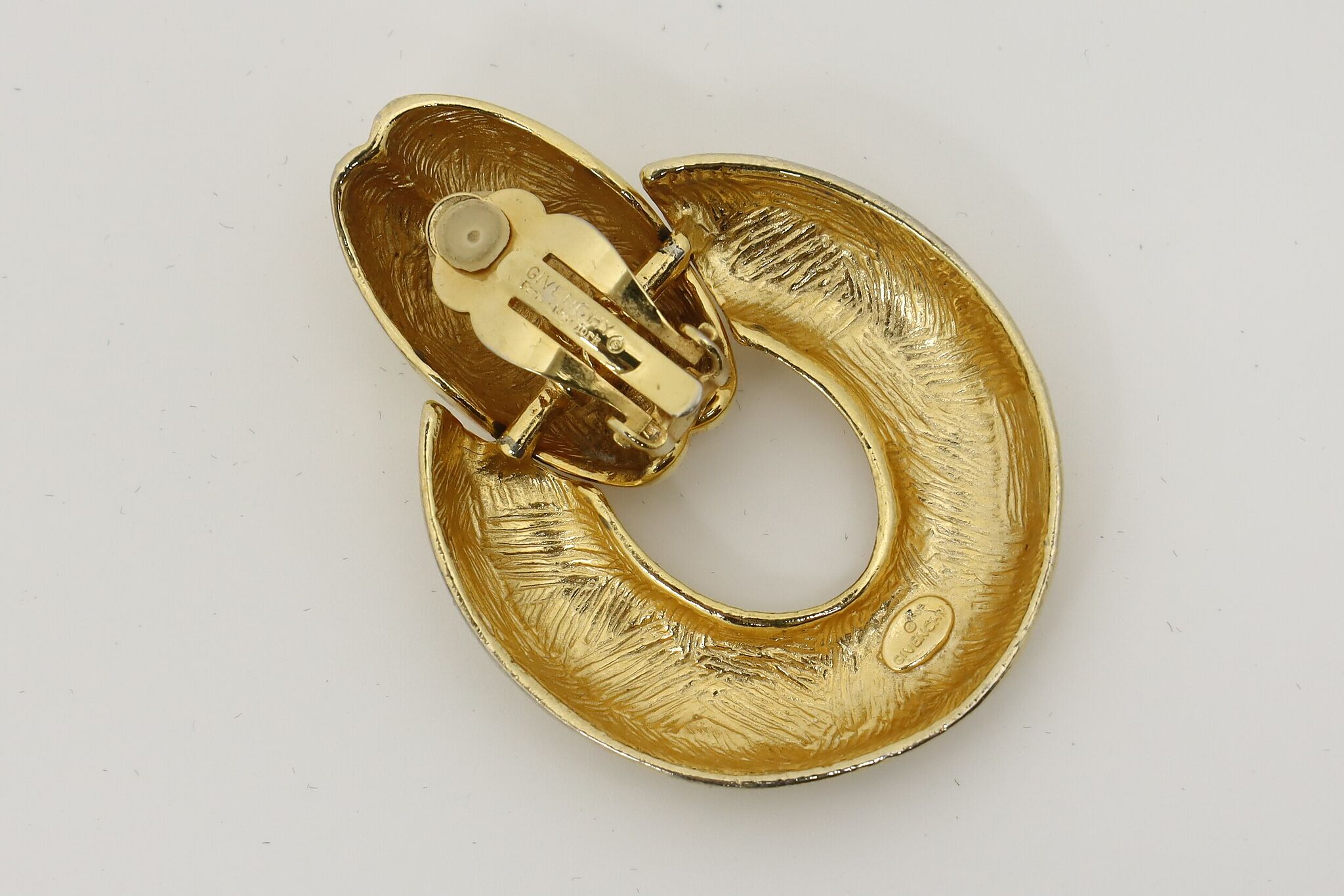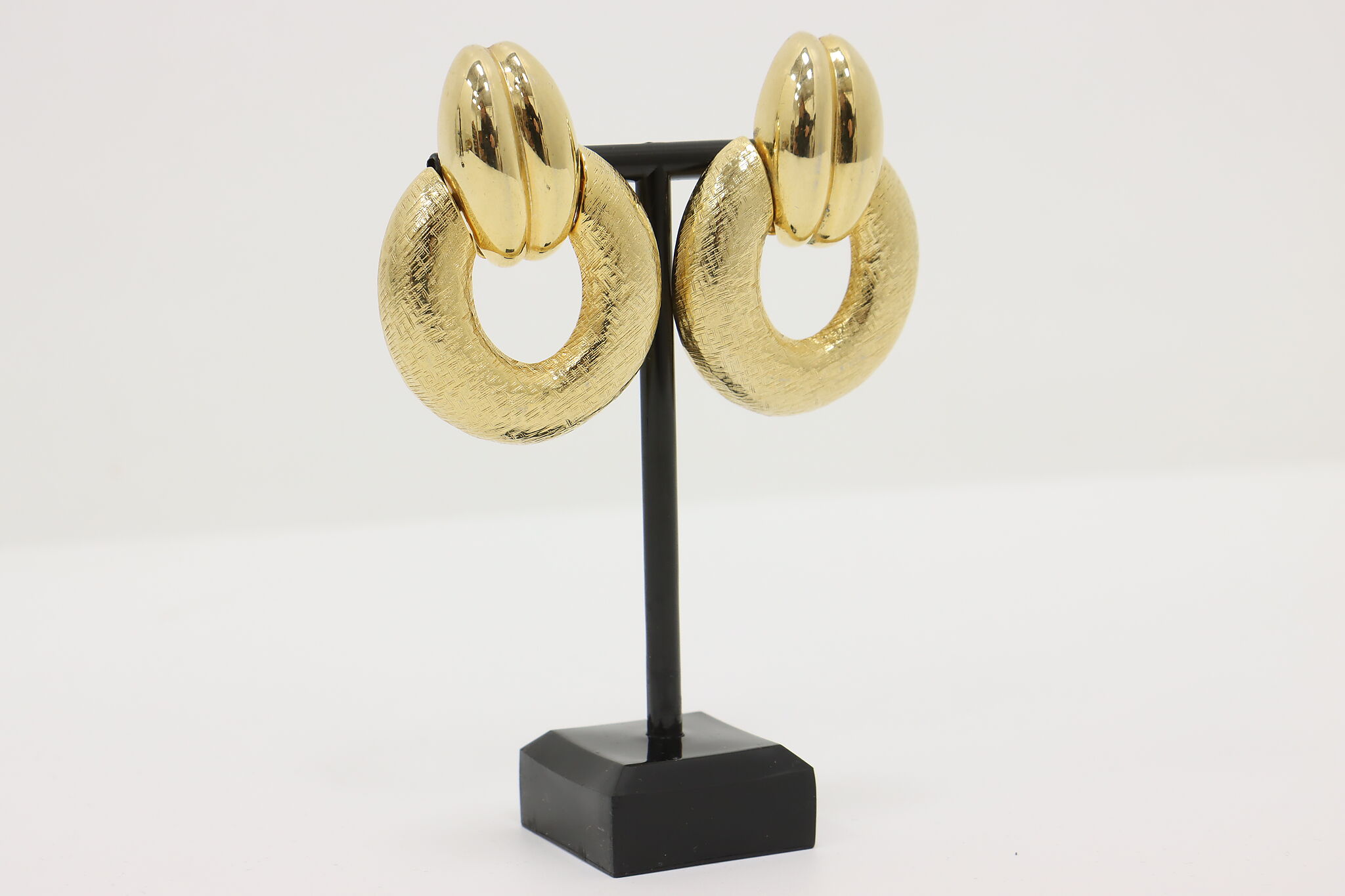 A bold pair of vintage gold-tone clip-on earrings featuring a textured circular drop and smooth polished top.