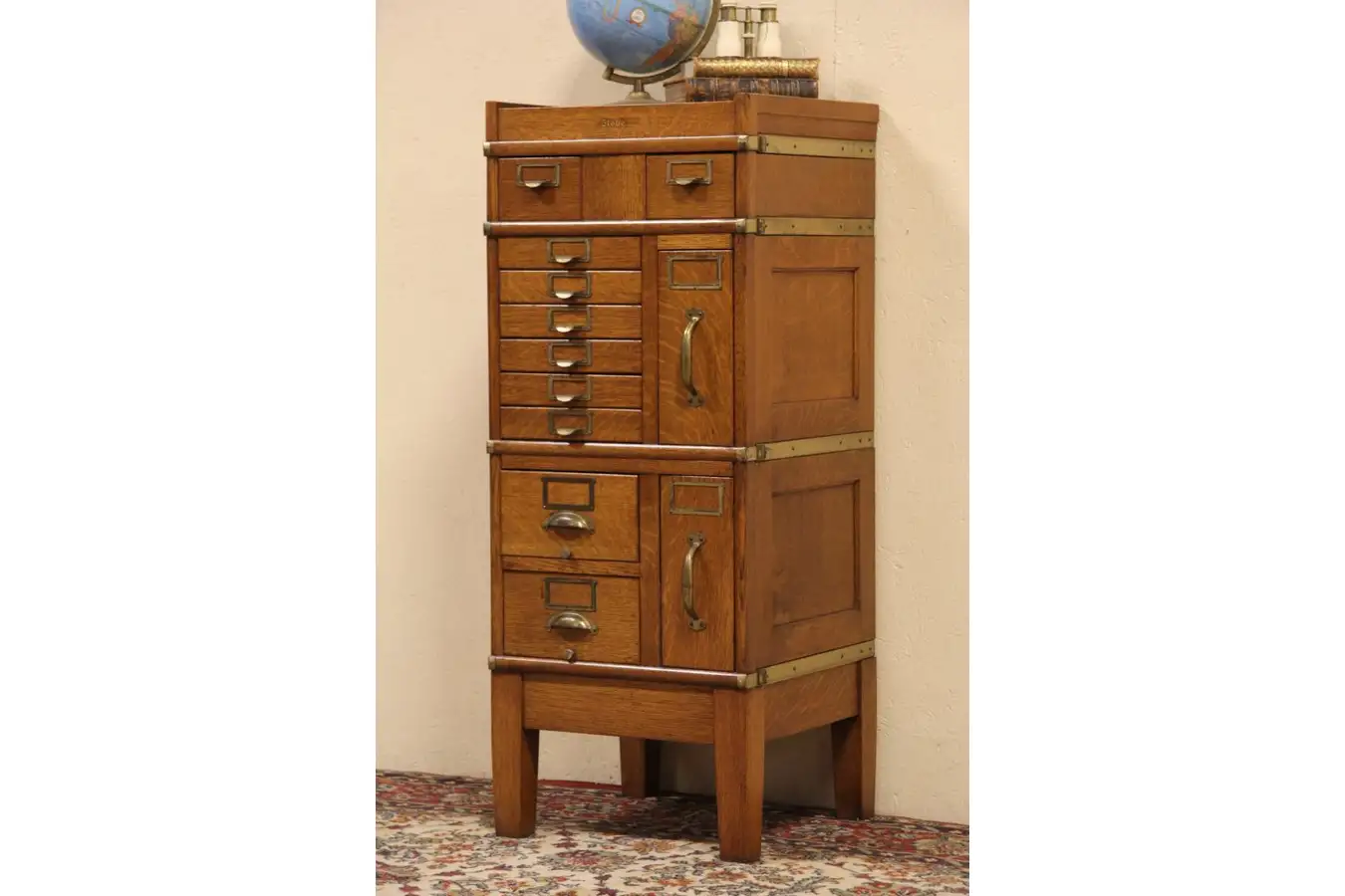 Signed by famous maker, "Globe" of Cincinnati, Ohio, about 1900, this splendid little stacking file cabinet has 12 drawers of various sizes.