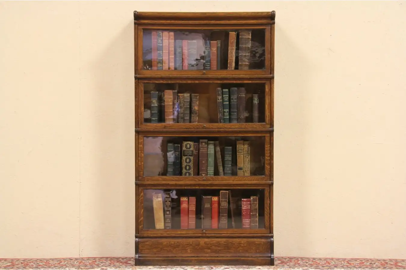 All original and signed by famous maker, "Globe Wernicke of Cincinnati," a four stack "lawyer's" bookcase is quarter sawn oak. The finish is very well preserved with minor mars and has been waxed and polished, it needs only an occasional wipe with a soft dry cloth to maintain its antique patina.