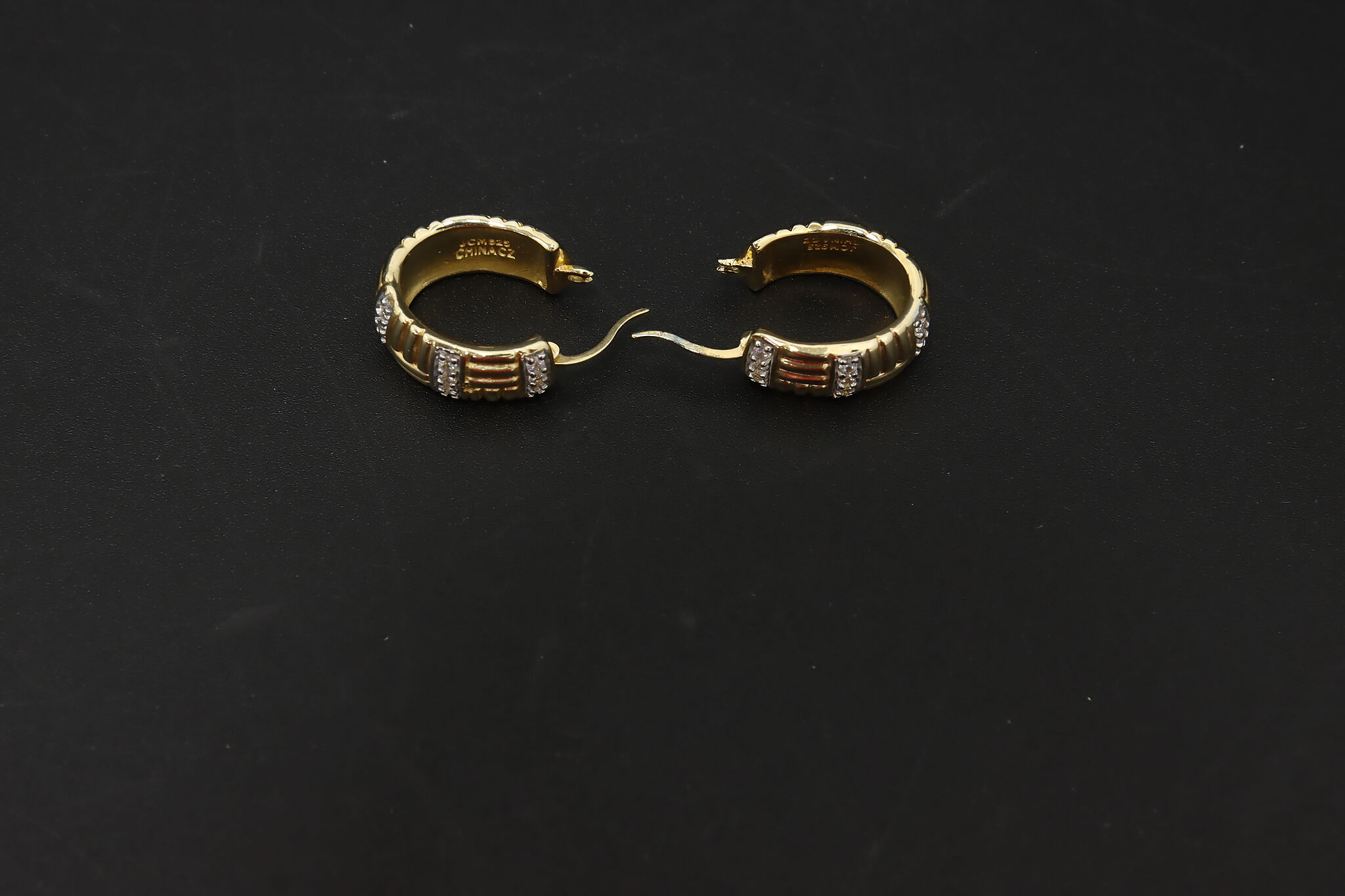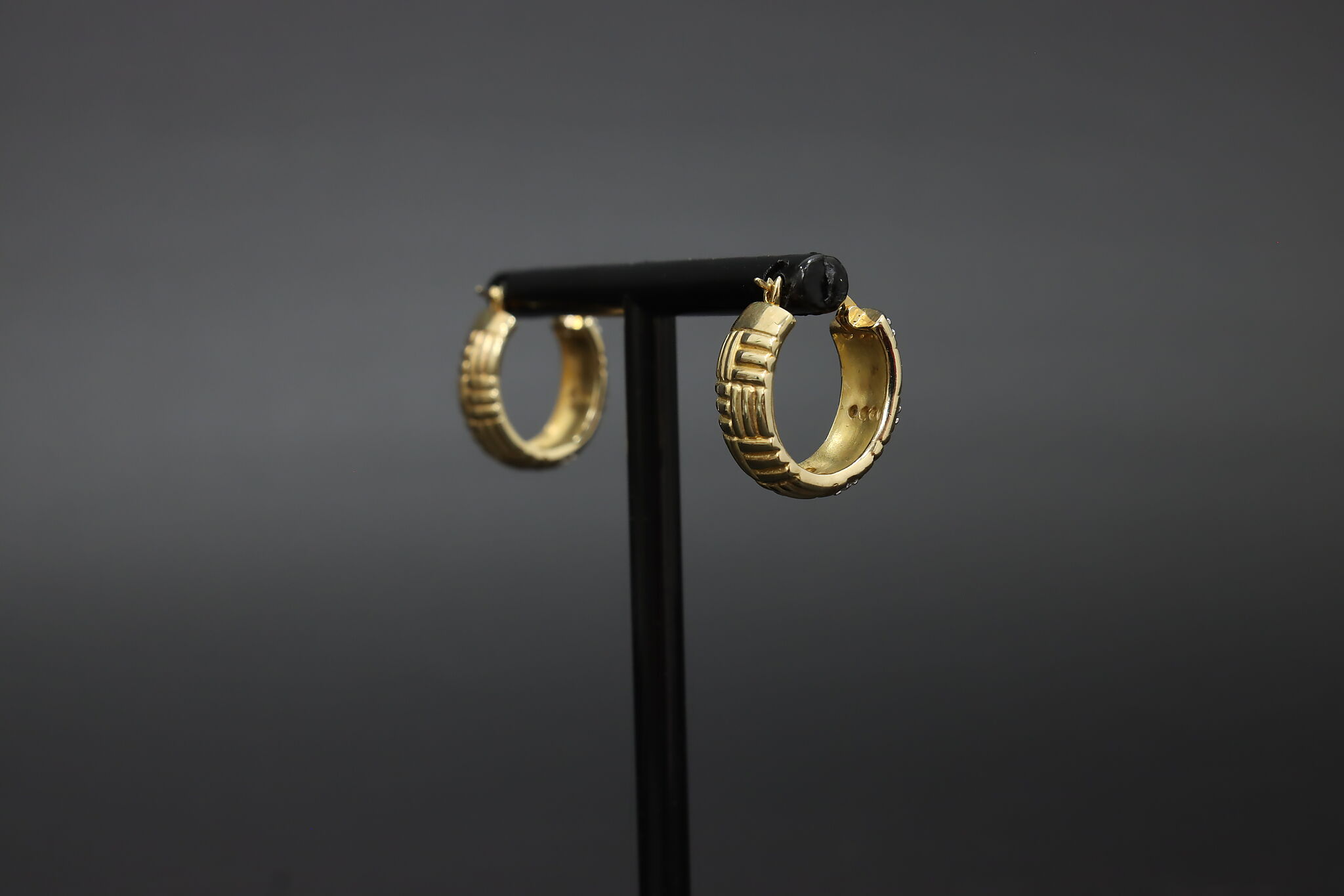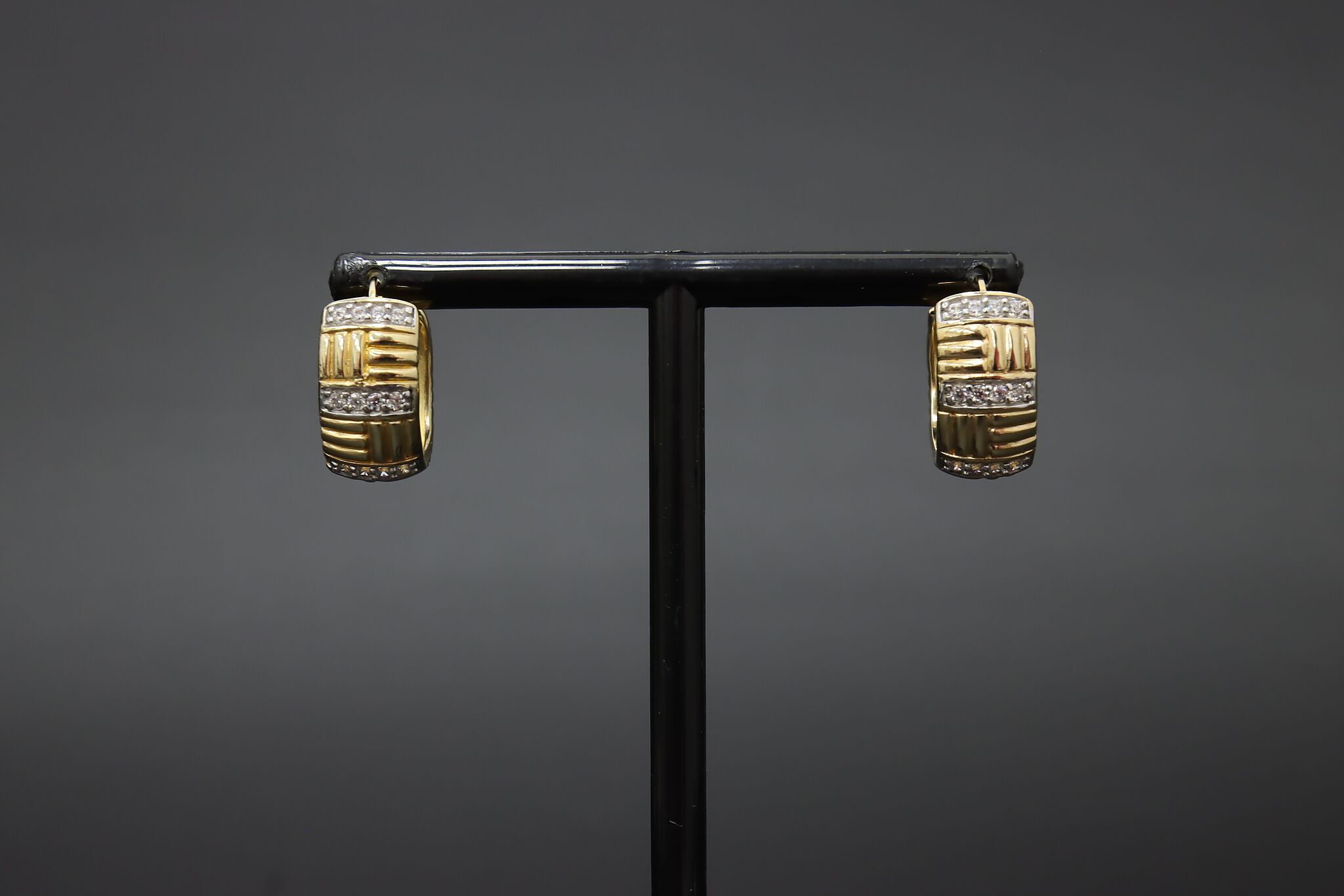 A stylish pair of gold-clad sterling silver hoop earrings featuring a ribbed design accented with sparkling stones.