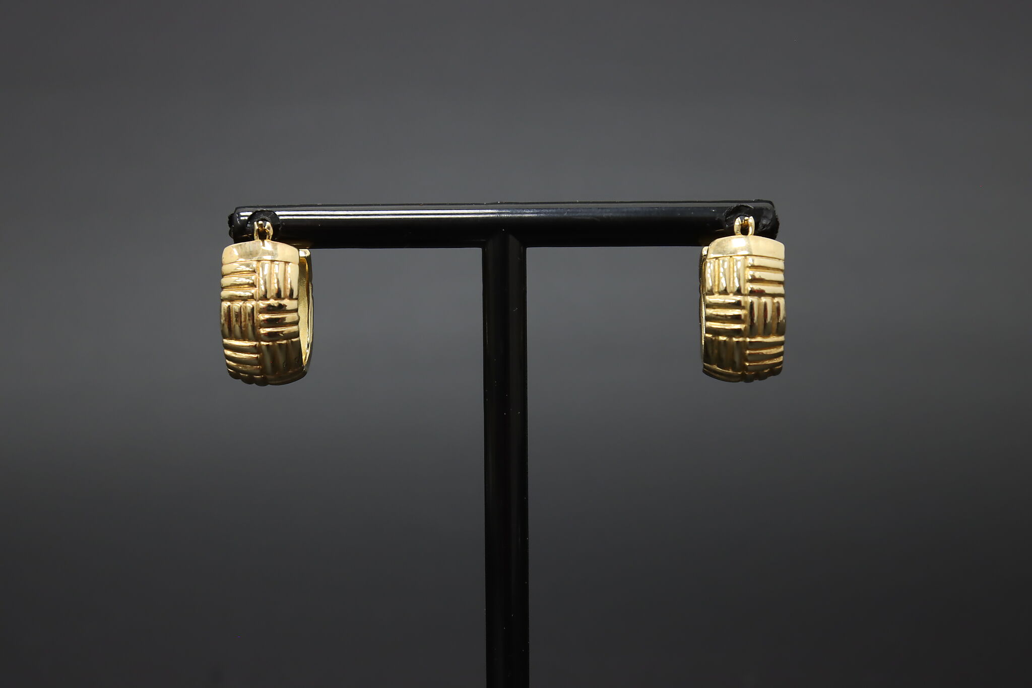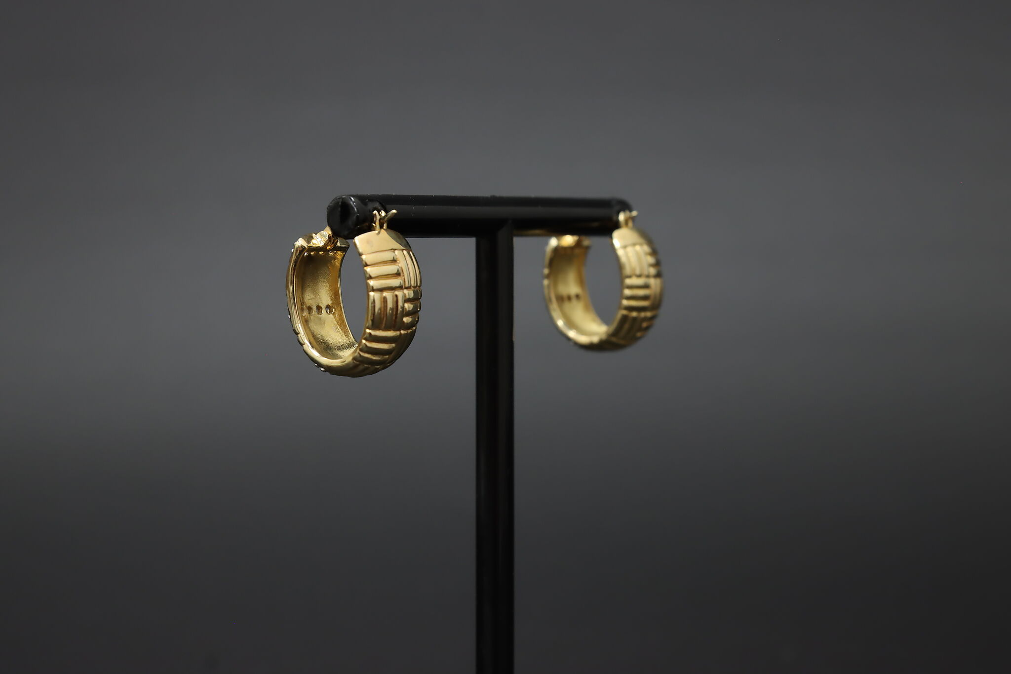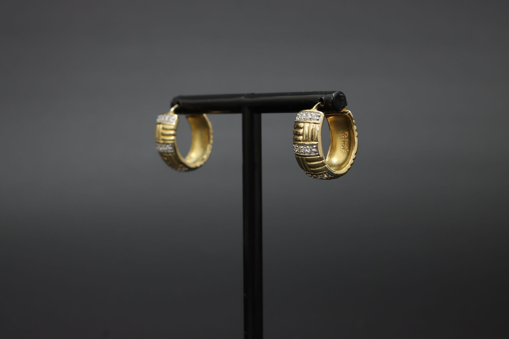 A stylish pair of gold-clad sterling silver hoop earrings featuring a ribbed design accented with sparkling stones.