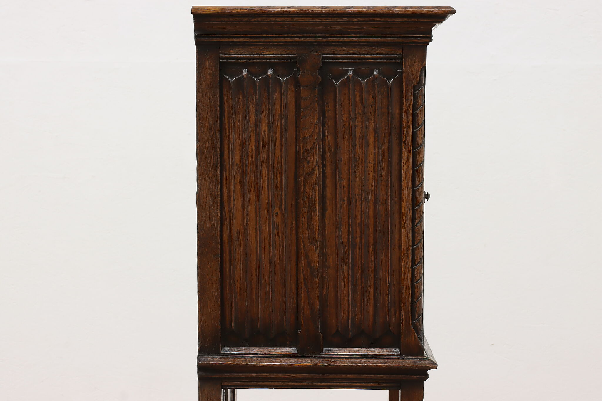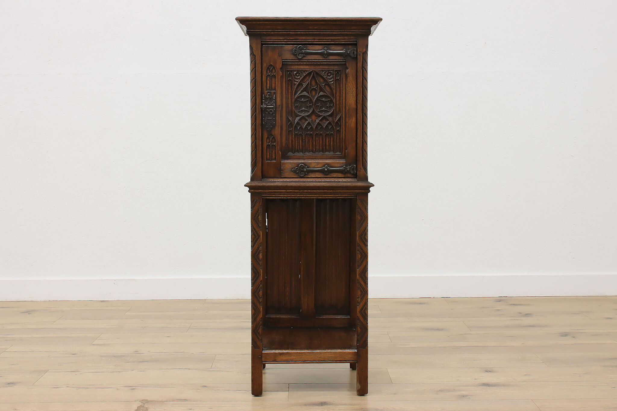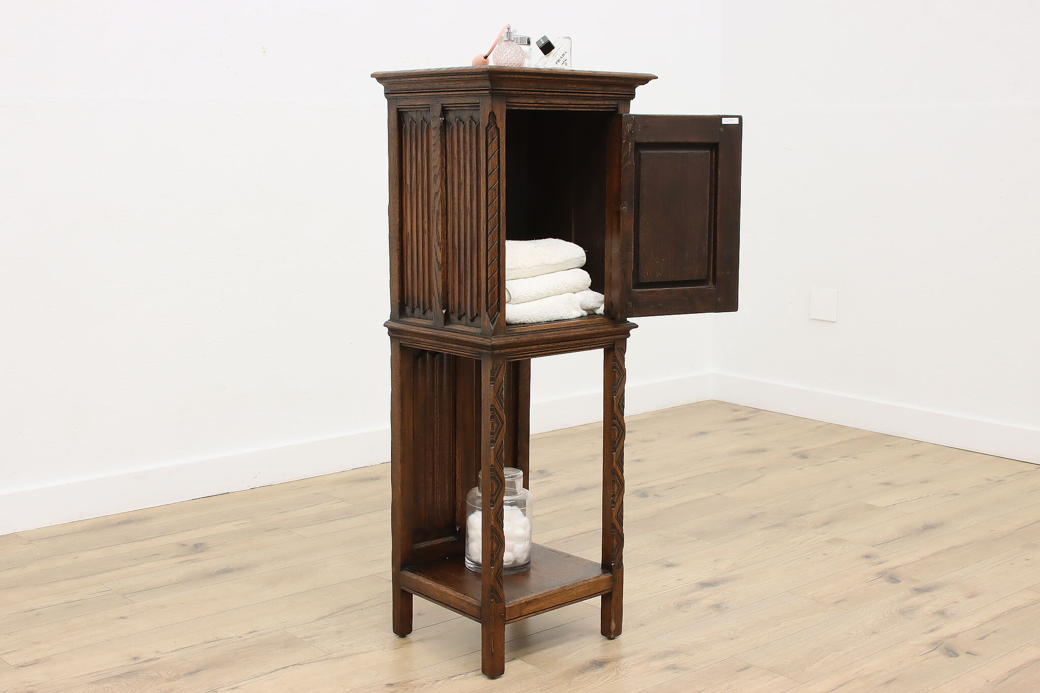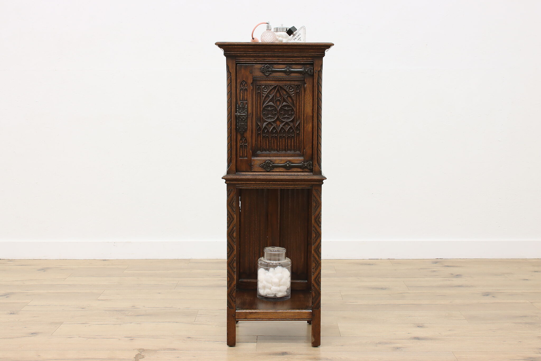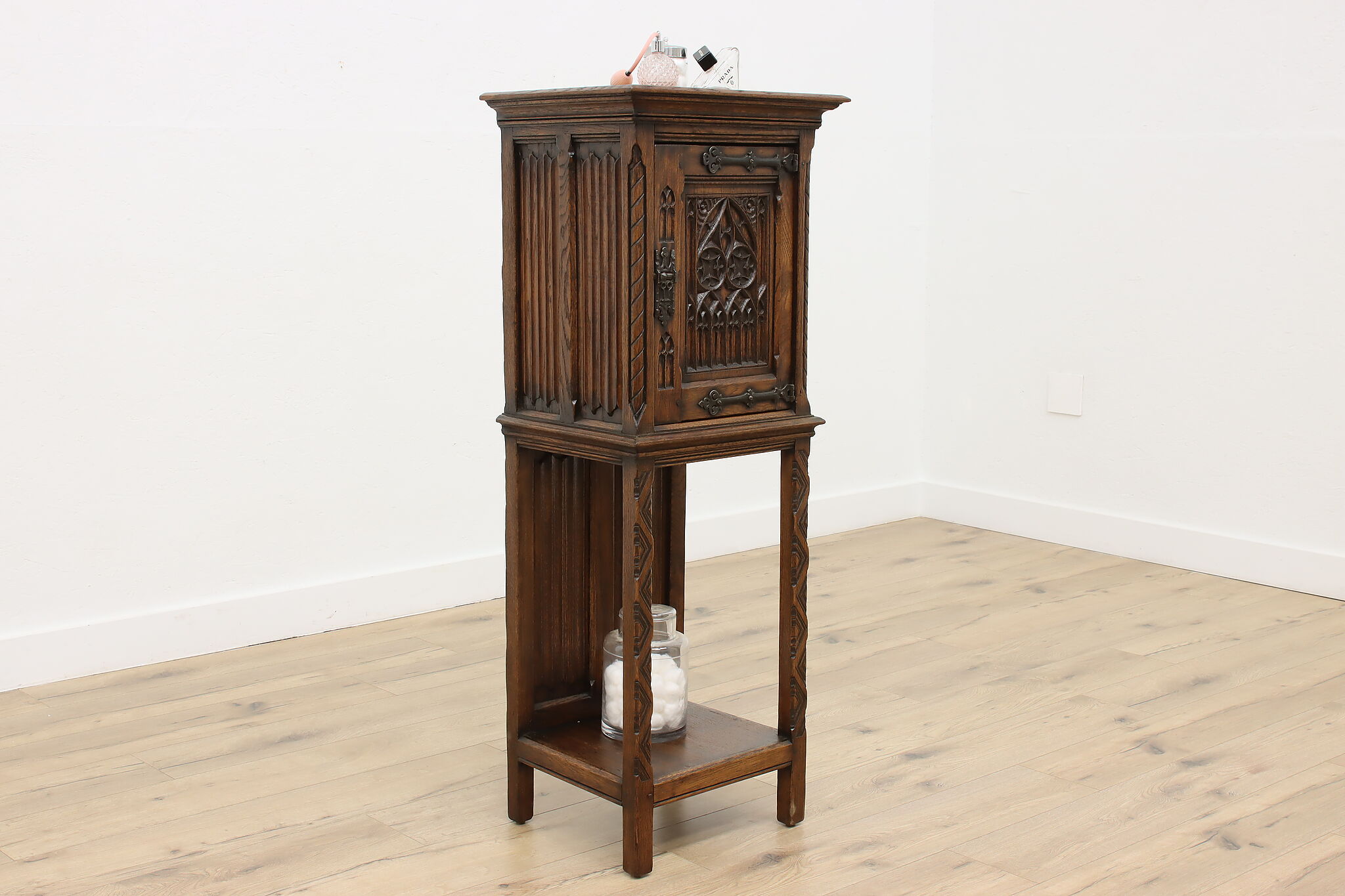Gorgeously designed after Gothic architecture, this hall or bath cabinet would be excellent as a small bar!