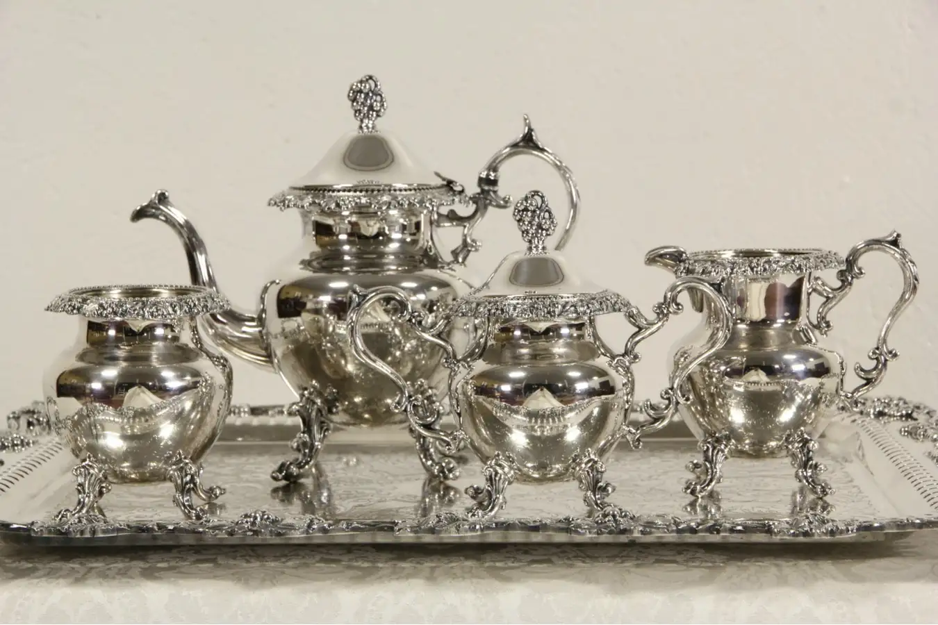 Signed "B.S. Co." with a hallmark as well, this lavish silver plate four piece coffee or tea service has a deeply embossed grapevine motif.