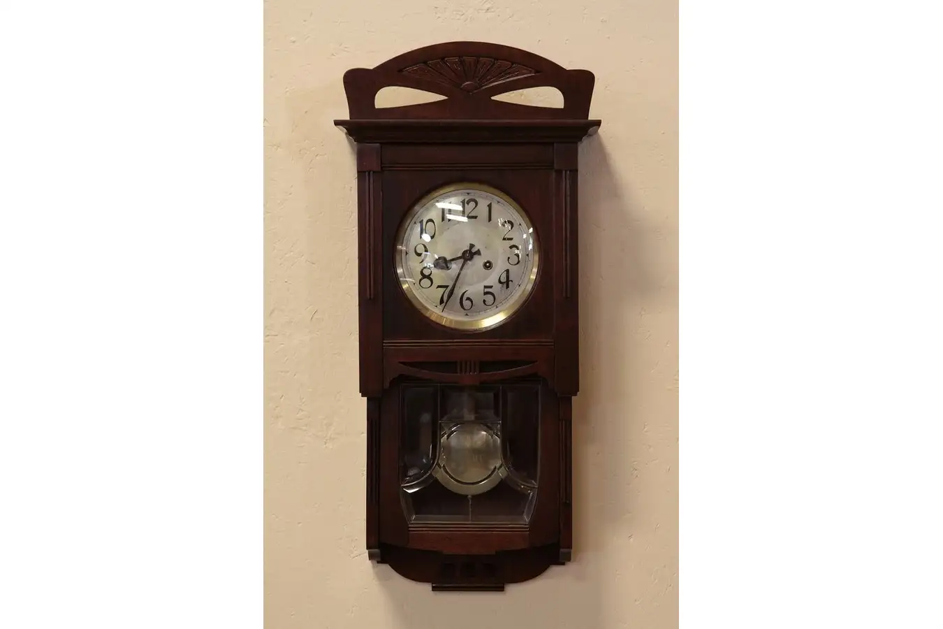 Signed by premier German clock maker, "Gustav Becker," this walnut wall clock dates from about 1920. The brass 30 day movement has been oiled and keeps excellent time, there is a four-note chime on the hour and half.