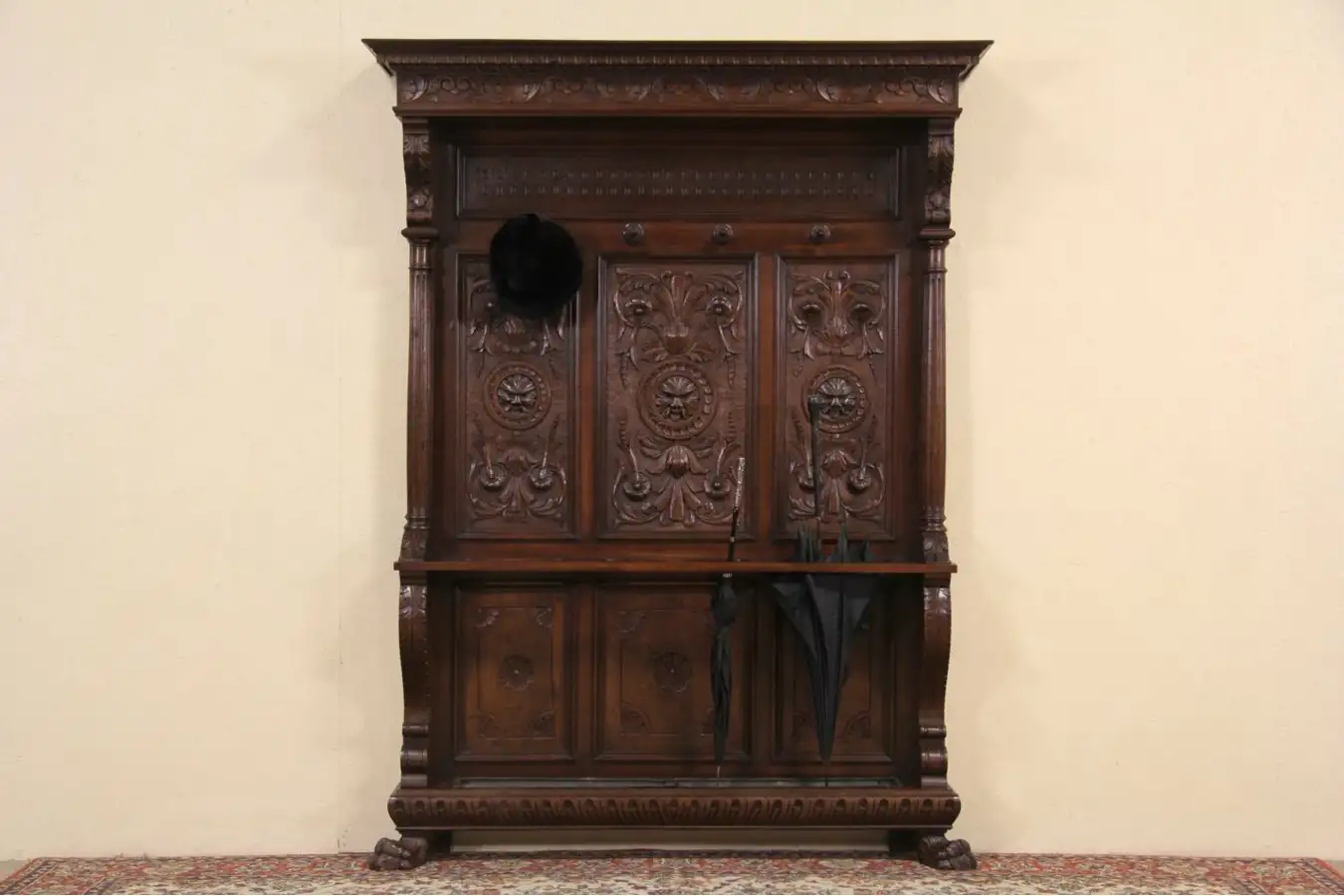 Carved coat or hat hooks and the tin drip pan for umbrellas are original on this antique furniture, made for a palazzo in northern Italy.