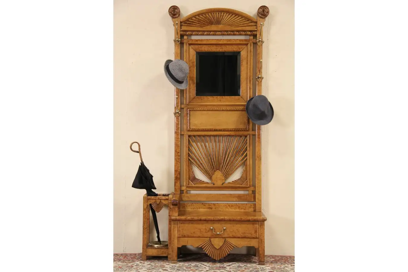 Dated "1891," this hand carved solid curly or "birdseye" maple hall bench and stand is one of a kind. The old glowing finish is probably original, it is very well preserved with warm antique patina and lots of stains, mars and shrinkage separations for character.