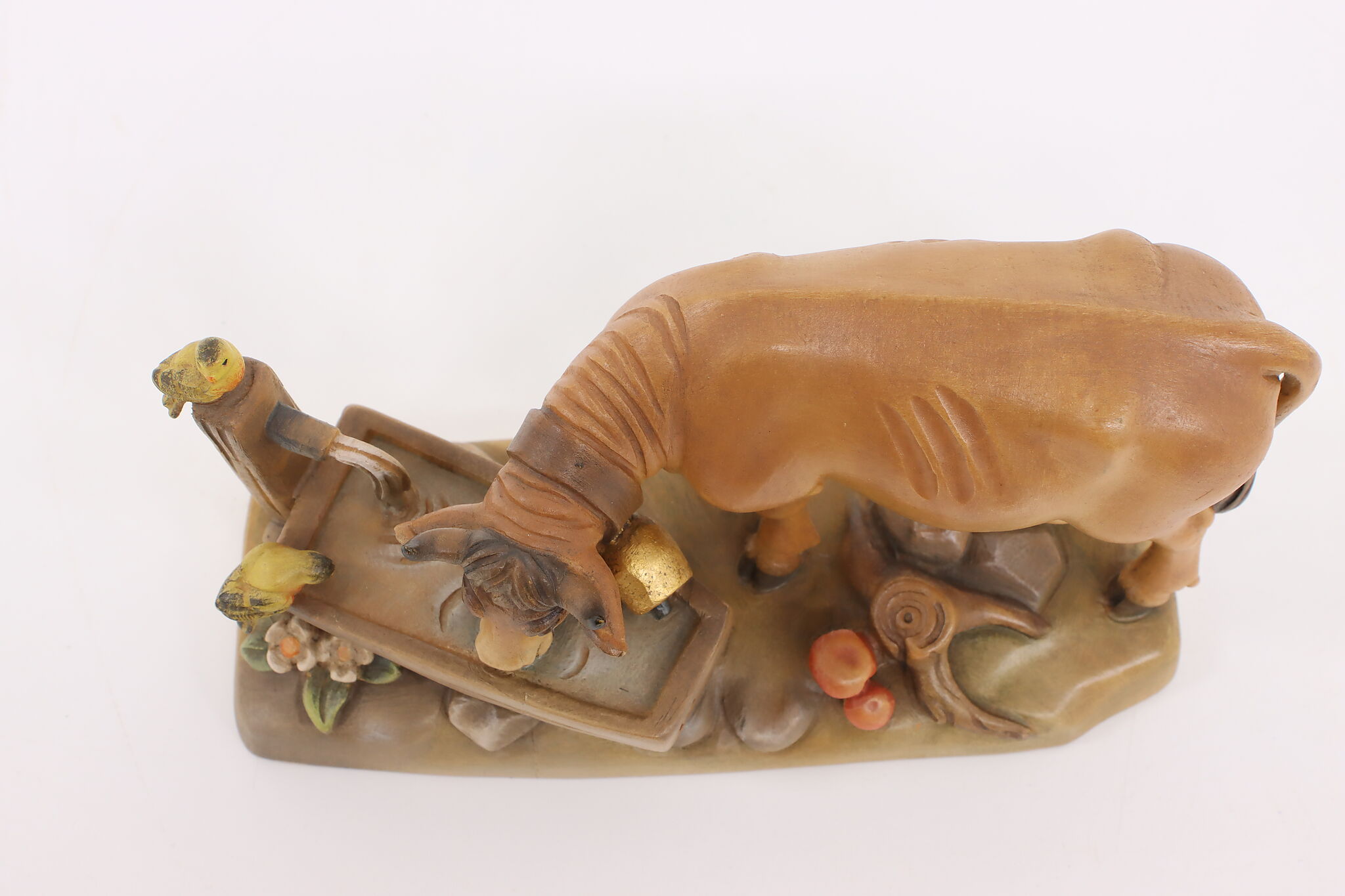 A charming sculpture depicts a dairy cow drinking from a water trough.