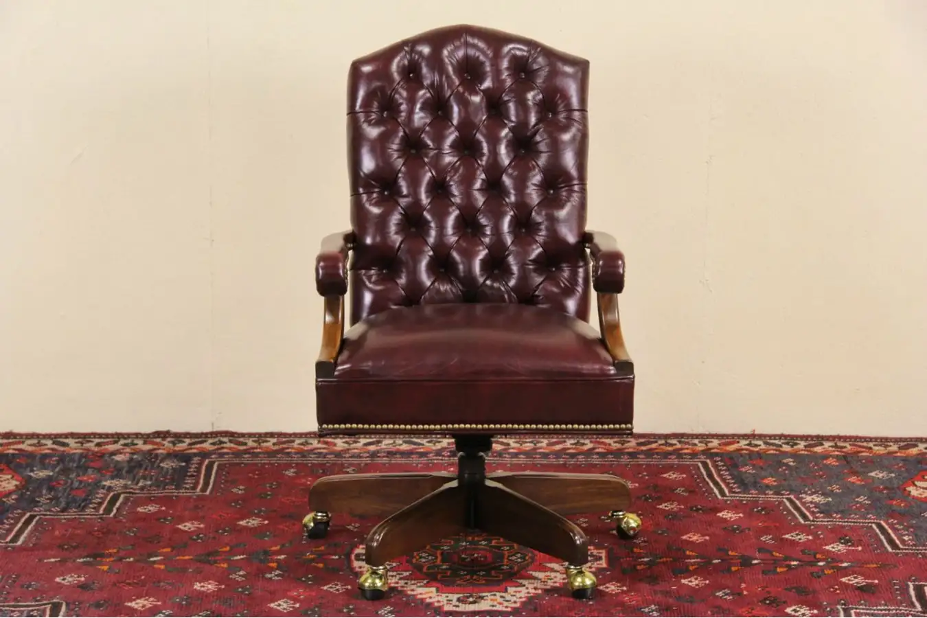 Signed by premier maker, "Harden," this solid cherry and tufted leather swivel desk or conference chair is about 25 years old. The original finish is extremely well preserved on a tight and strong frame. Leather upholstery has brass nailhead trim and only minor mars, see photos.