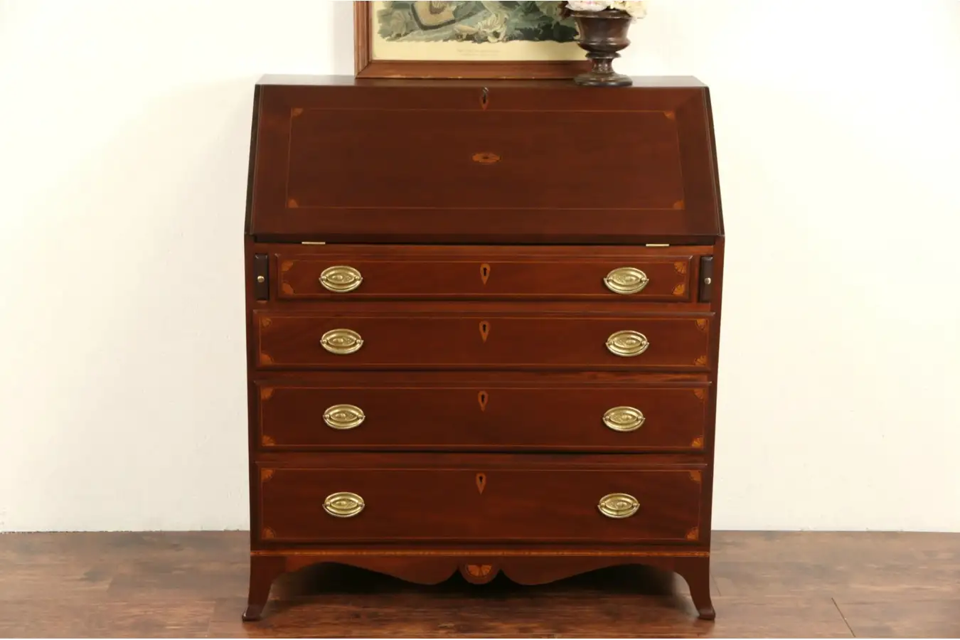 From the Hepplewhite period in the 1820's, this New England secretary desk is solid mahogany with inlaid marquetry and banding. Hand cut dovetail joints are visible on the upper corners and in all the drawer joinery.