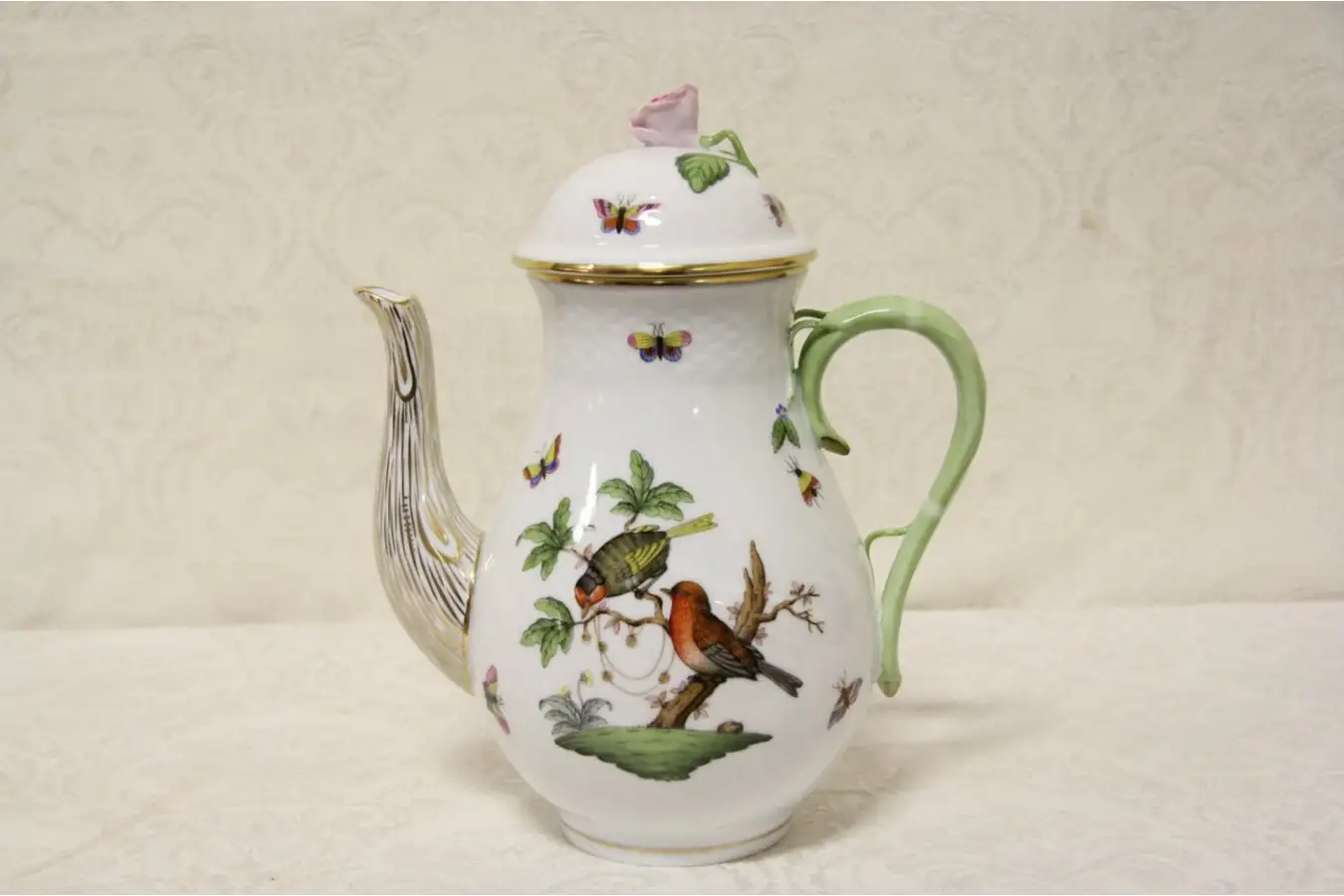 Famous hand painted and signed "Herend" china, this "Rothschild Bird" pattern coffee pot with a pink rose measures 10" tall.