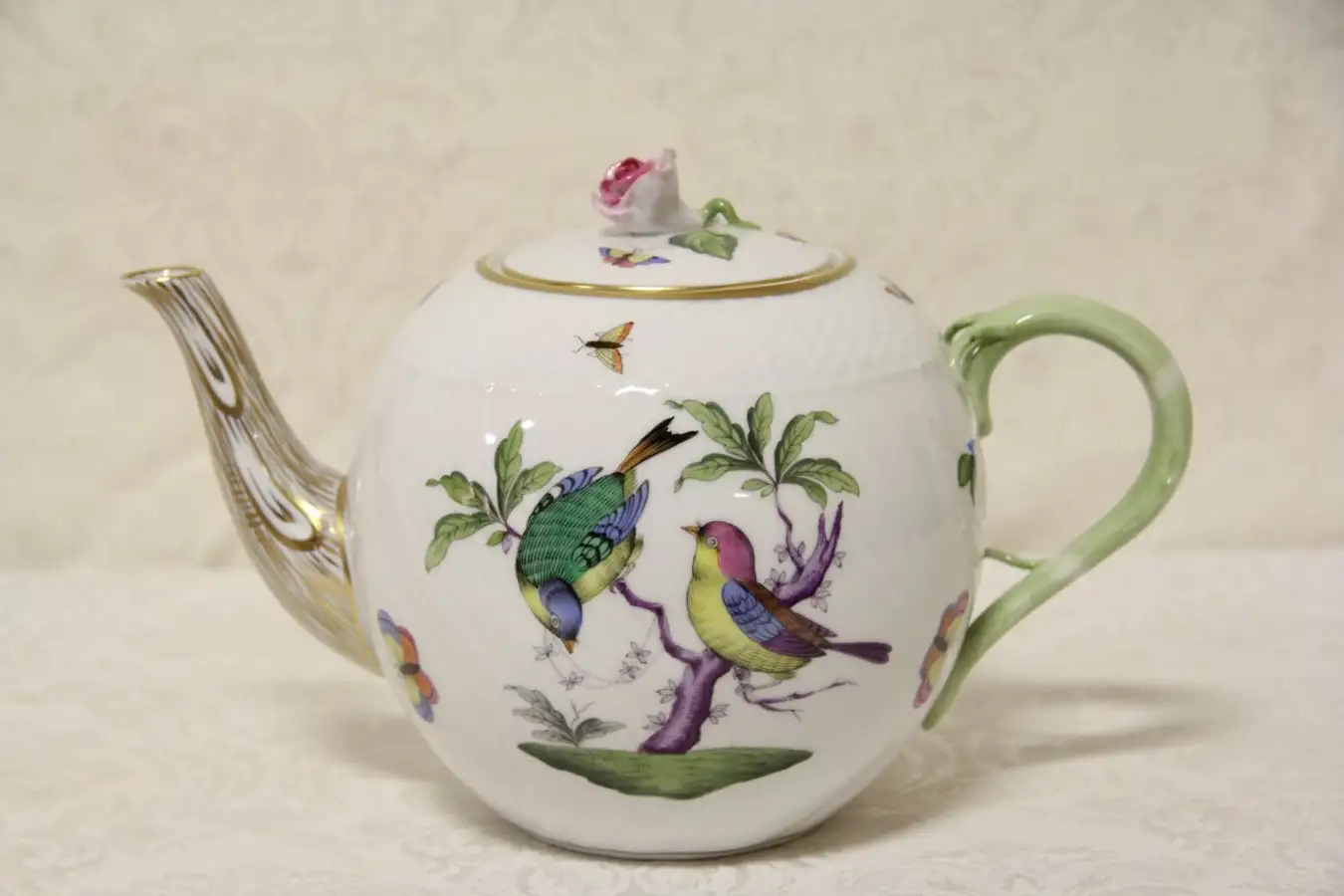 Famous hand painted and signed "Herend" china, this "Rothschild Bird" pattern tea pot with a pink rose and purple branch measures 6 3/4" tall.