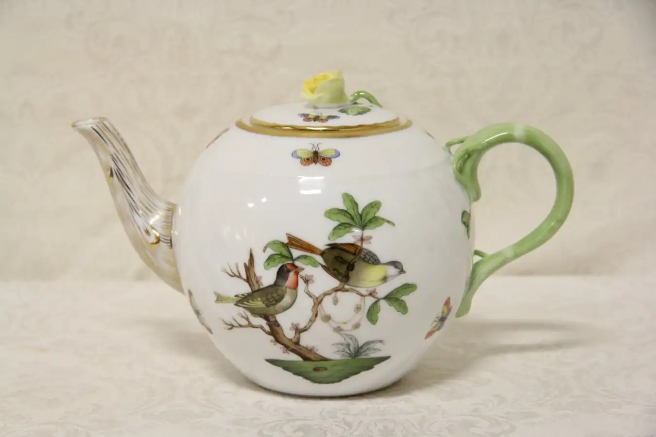 Famous hand painted and signed "Herend" china, this "Rothschild Bird" pattern tea pot with a yellow rose measures 6" tall.