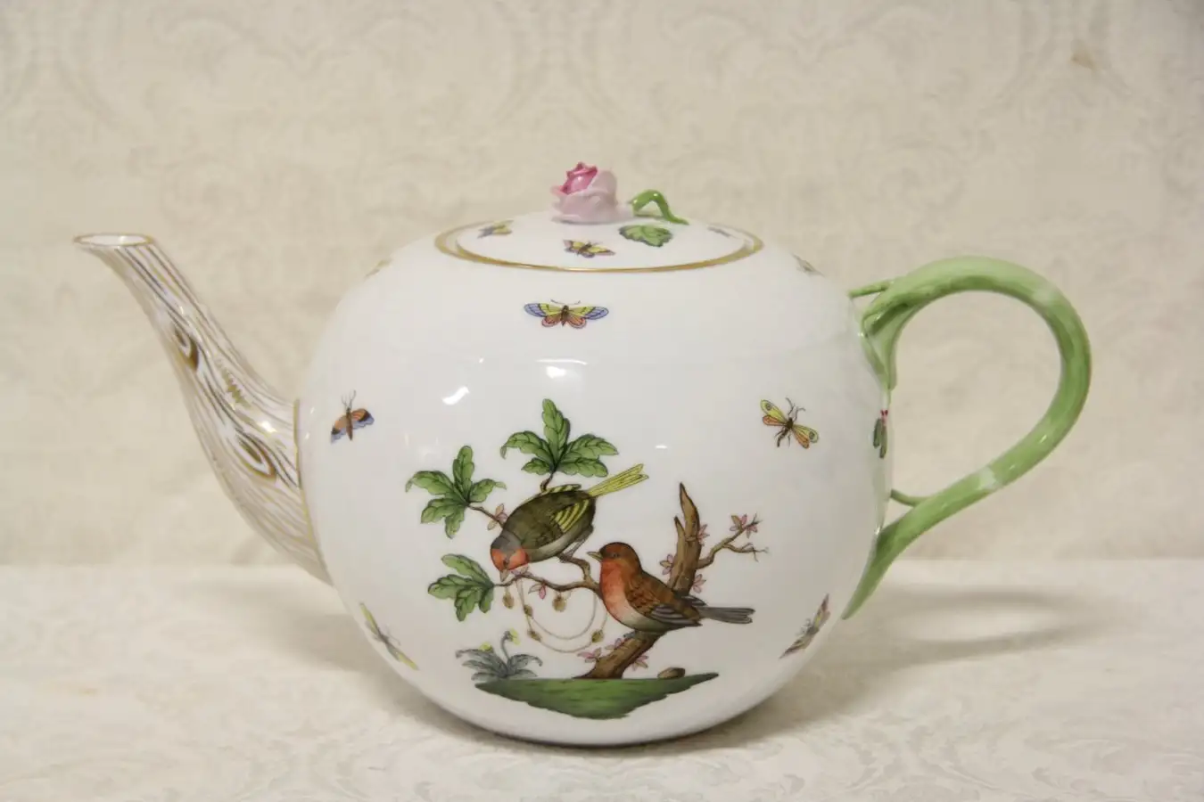 The bird pattern was created in 1860 for the Rothschild banking family, depicting the famous story of the Baroness losing a necklace in her garden. The jewelry was retrieved by a gardener who saw birds playing with it in a tree. The pattern is considered one of the finest examples of hand painting on porcelain, and is still hand made today.