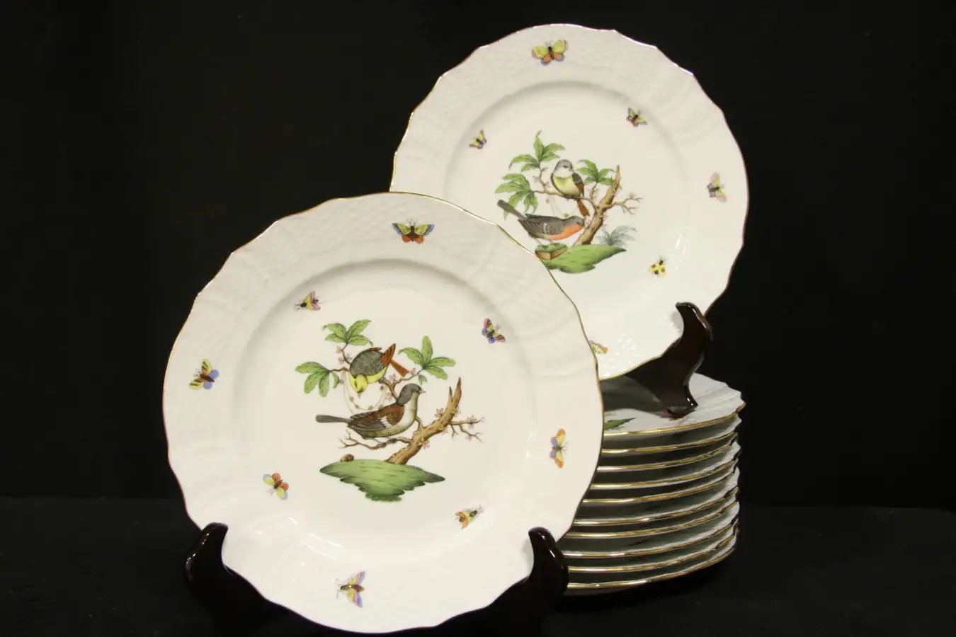Famous hand painted and signed "Herend" china, this "Rothschild Bird" pattern complete set of twelve different bird design service plates are 11" diameter.