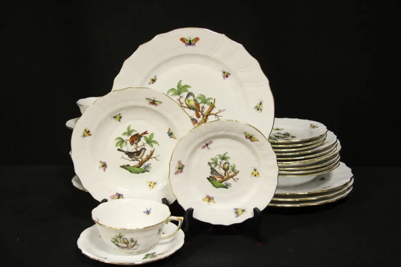 Famous hand painted and signed "Herend" china, this "Rothschild Bird" pattern set of four place settings of six pieces each have birds as shown. Each place setting includes a 10 1/2" dinner plate, 8" soup plate, 7 1/2" salad plate, 6" bread and butter plate, 6" saucer and 2" tall tea or coffee cup.