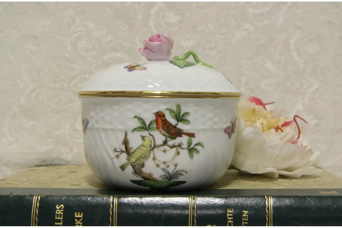An exquisite china covered bowl is nice for dessert, a fruit compote or sugar. It is undamaged and appears to never have been used. Herend China was founded in 1826 in Herend, a village in the west of Hungary, and furnished fine porcelain by appointment to the Hapsburg royal family, Emperors of Austria Hungary.