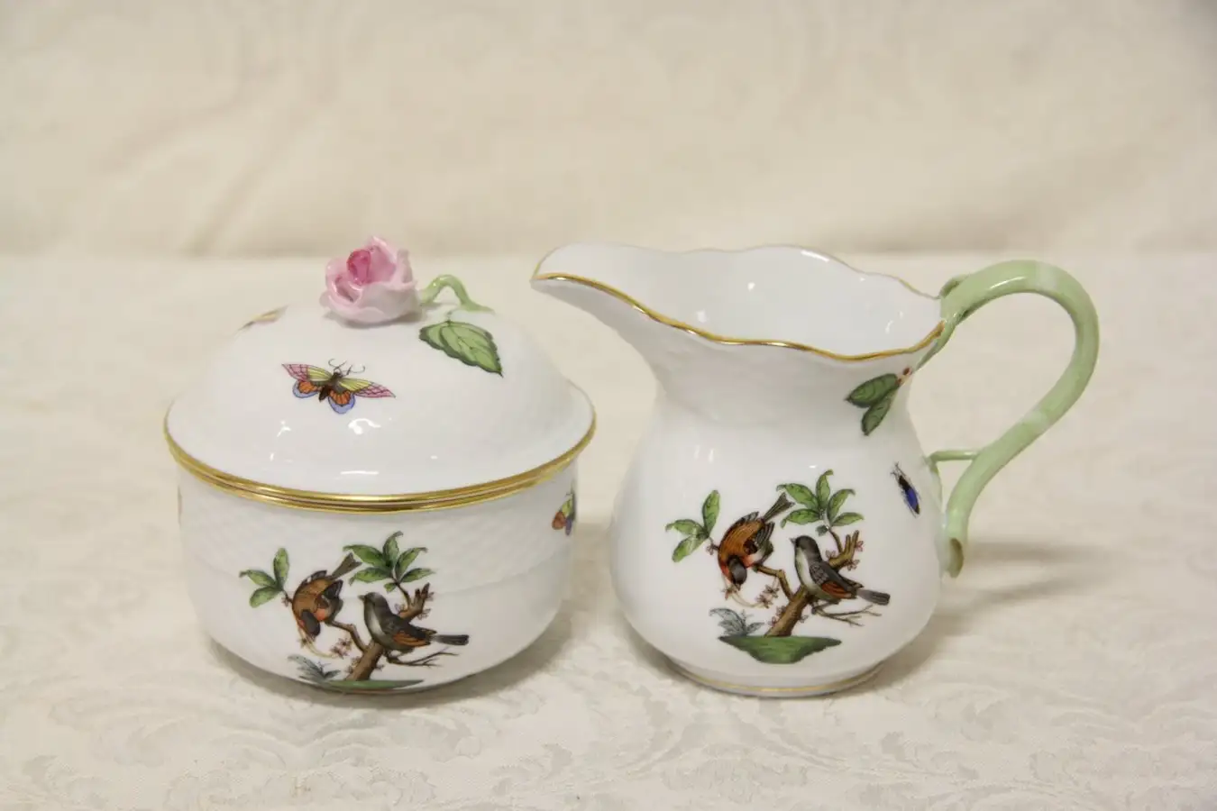 Famous hand painted and signed "Herend" china, this "Rothschild Bird" pattern covered sugar with rose and bird creamer measure 4" tall and 3 3/4" tall.