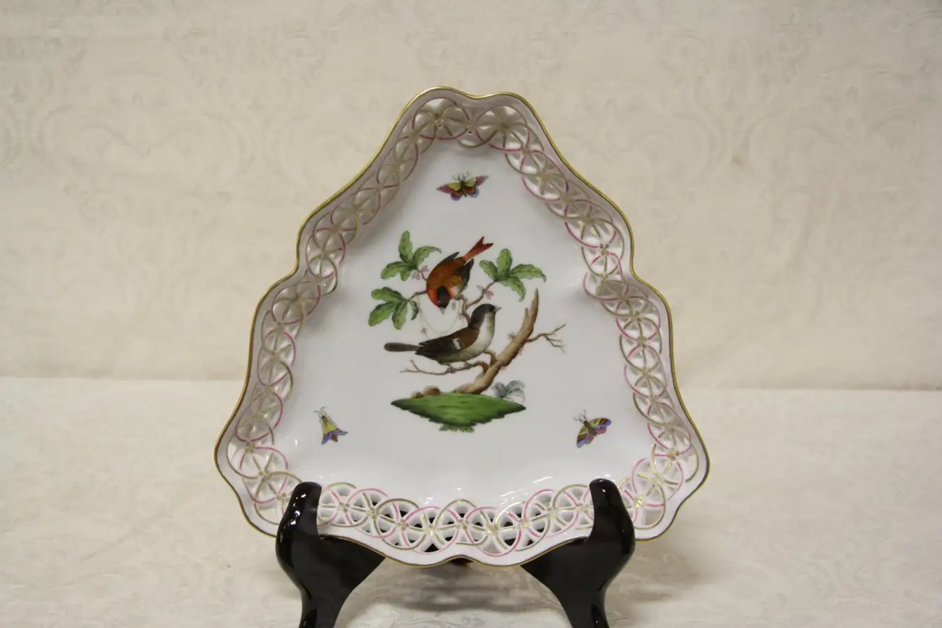 Famous hand painted and signed "Herend" china, this "Rothschild Bird" pattern triangular filigree tray is 9 1/2" wide.