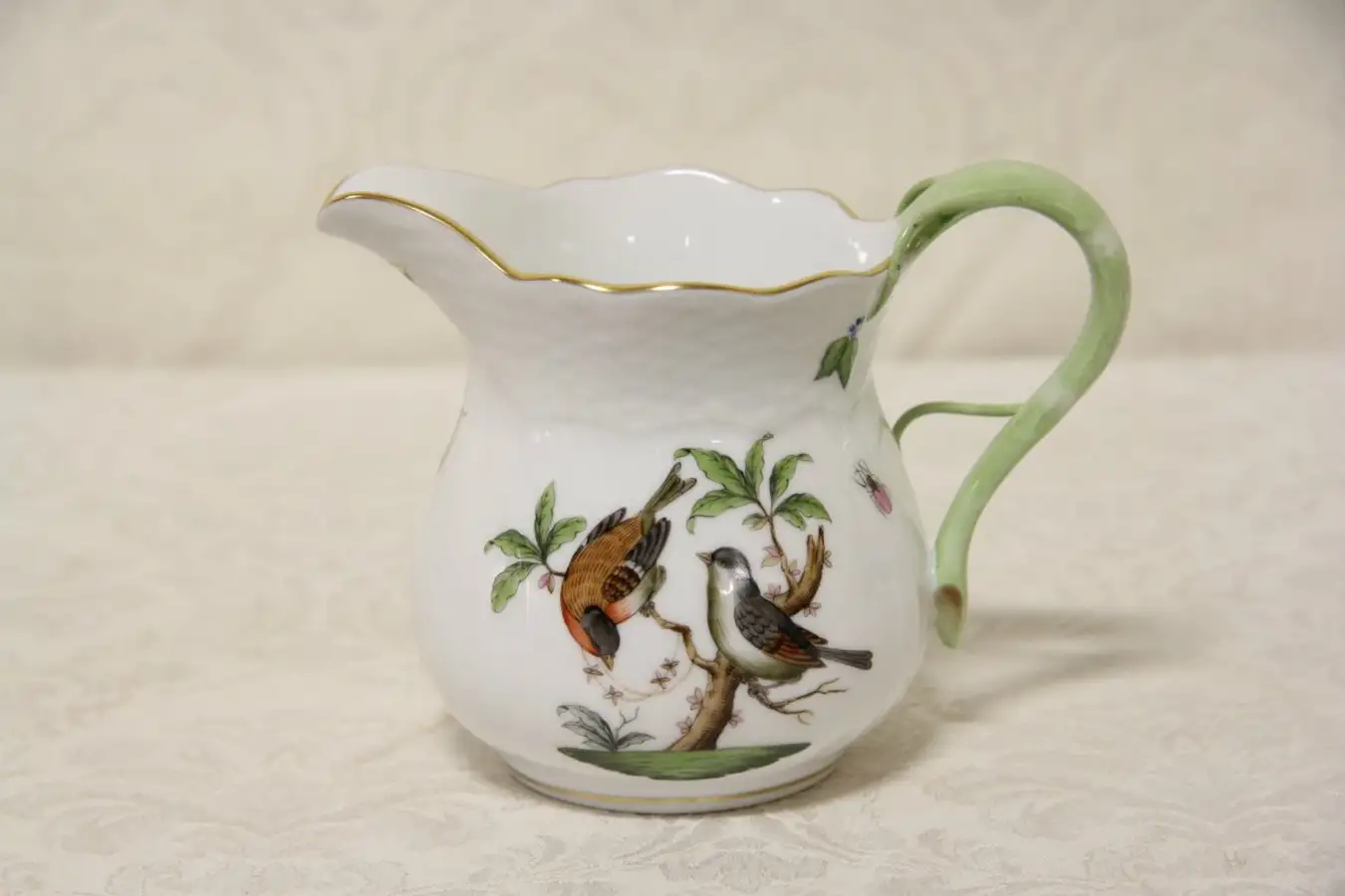 Famous hand painted and signed "Herend" china, this "Rothschild Bird" pattern milk pitcher measures 6 1/4" tall.