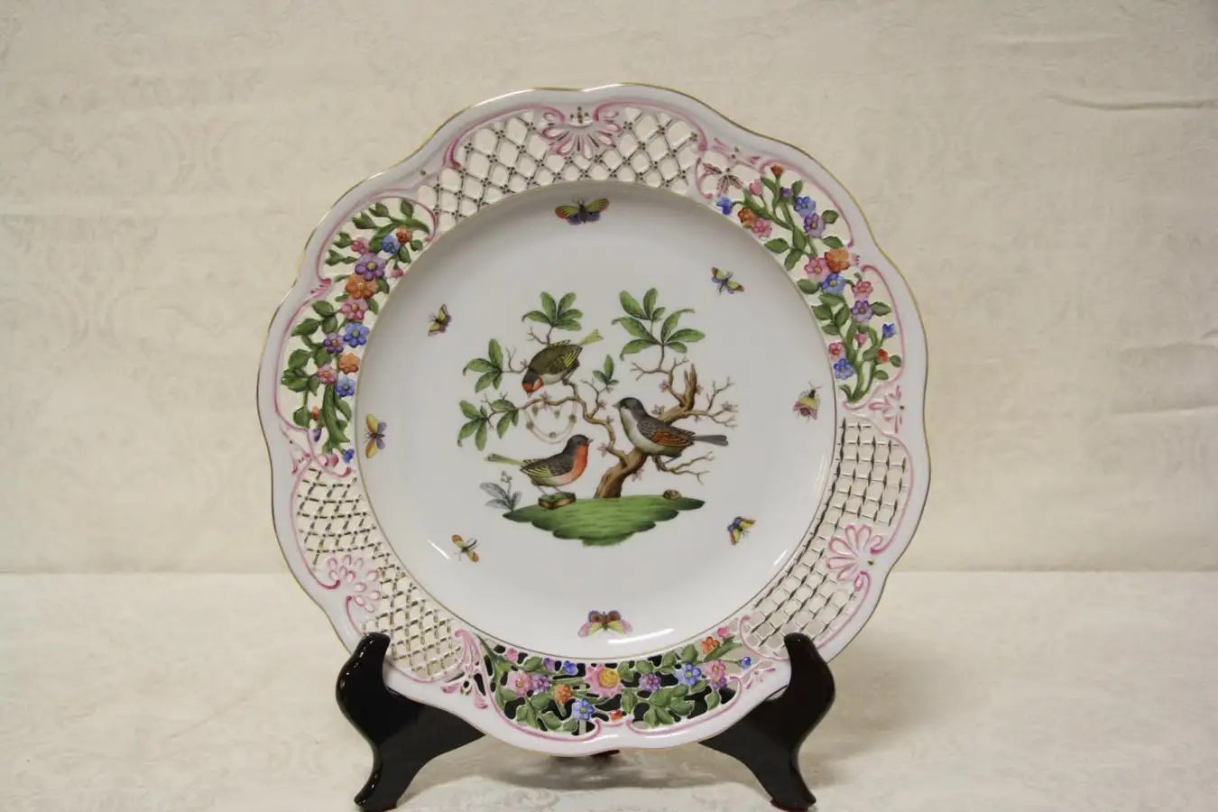 Famous hand painted and signed "Herend" china, this "Rothschild Bird" pattern open rim display plate is 13 1/2" diameter. On the back are holes for hanging wire to display on a wall.