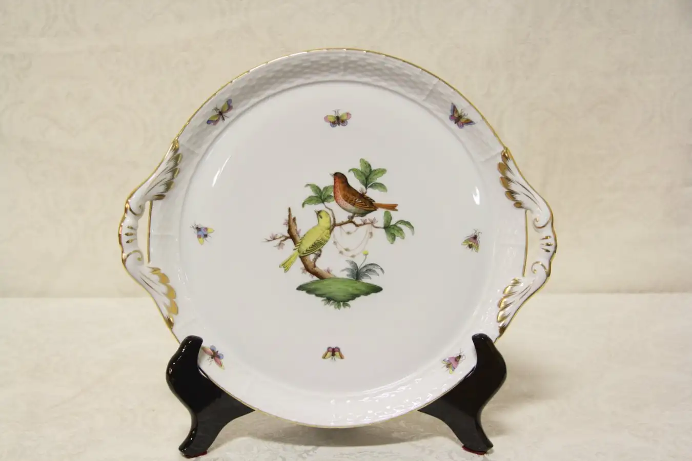 Famous hand painted and signed "Herend" china, this "Rothschild Bird" pattern round tray with handles is 11 1/2 x 13."
